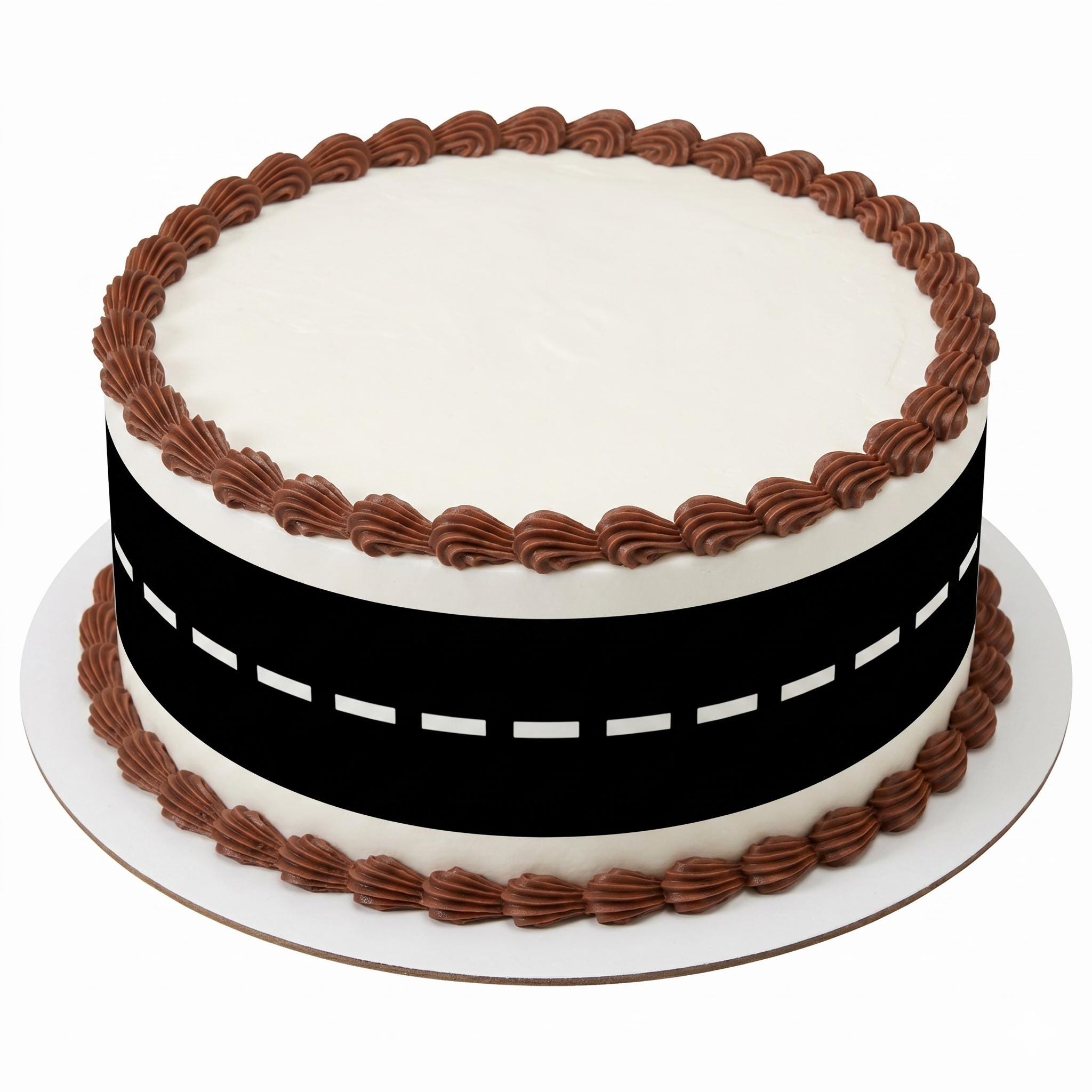 Our edible cake side strips arrive printed exactly as pictured on a premium fondant frosting sheet (cake not included). Each sheet includes 3 strips, approximately 9 x 2.5 inches each. A bold black asphalt road with white dashed center lines wraps your cake in classic race track style — perfect for car themed birthday parties, monster truck events, race car celebrations, and any little (or big) car lover's special day. Simply trim to size with scissors or a pizza cutter, peel from the backing, and wrap around your frosted cake for a seamless, professional border. Made to order with vibrant, food-safe edible ink on a high-quality icing sheet that blends into buttercream, fondant, royal icing, or whipped frosting.
