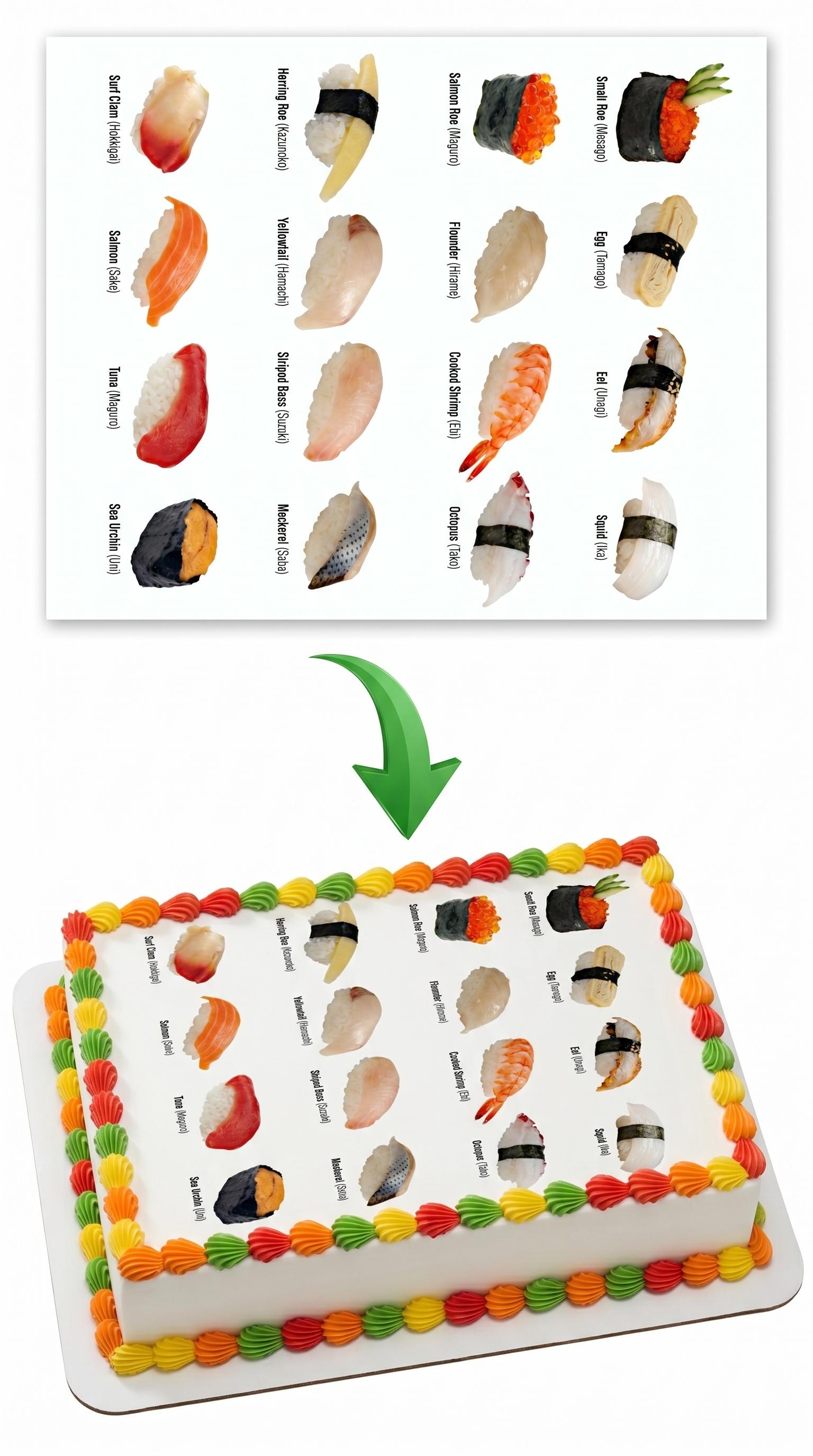Our edible cake toppers arrive printed exactly as pictured on a premium fondant frosting sheet (cake not included). A stunning labeled reference chart featuring 16 varieties of nigiri sushi — salmon, tuna, yellowtail, striped bass, mackerel, flounder, cooked shrimp, octopus, squid, eel, egg, sea urchin, salmon roe, herring roe, scad roe, and surf clam — makes for a showstopping and educational centerpiece any sushi lover will go wild over. Simply trim to size, peel from the backing, and place on your frosted cake for a stunning, professional finish. Made to order with vibrant, food-safe edible ink on a high-quality icing sheet that blends seamlessly into buttercream, fondant, royal icing, or whipped frosting.