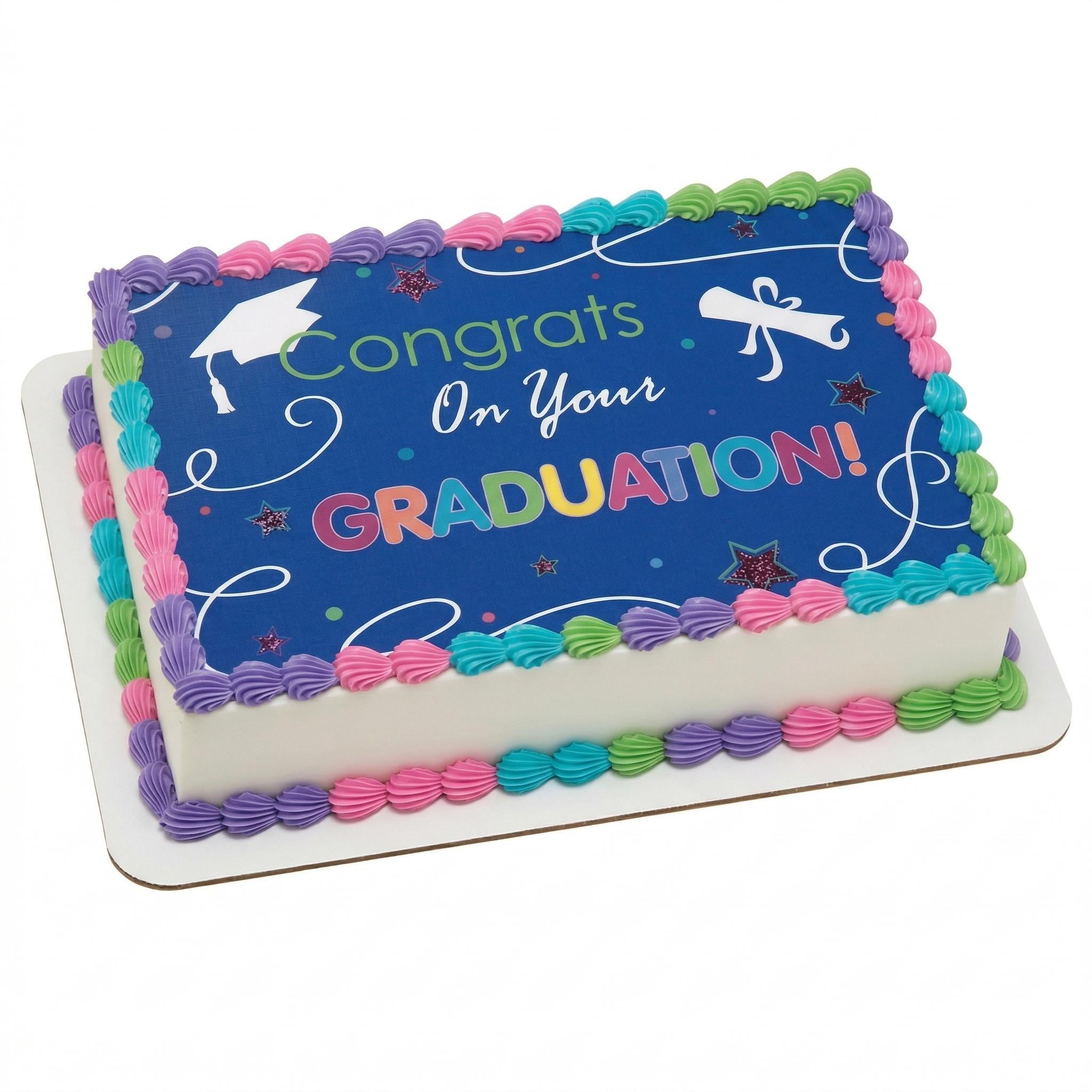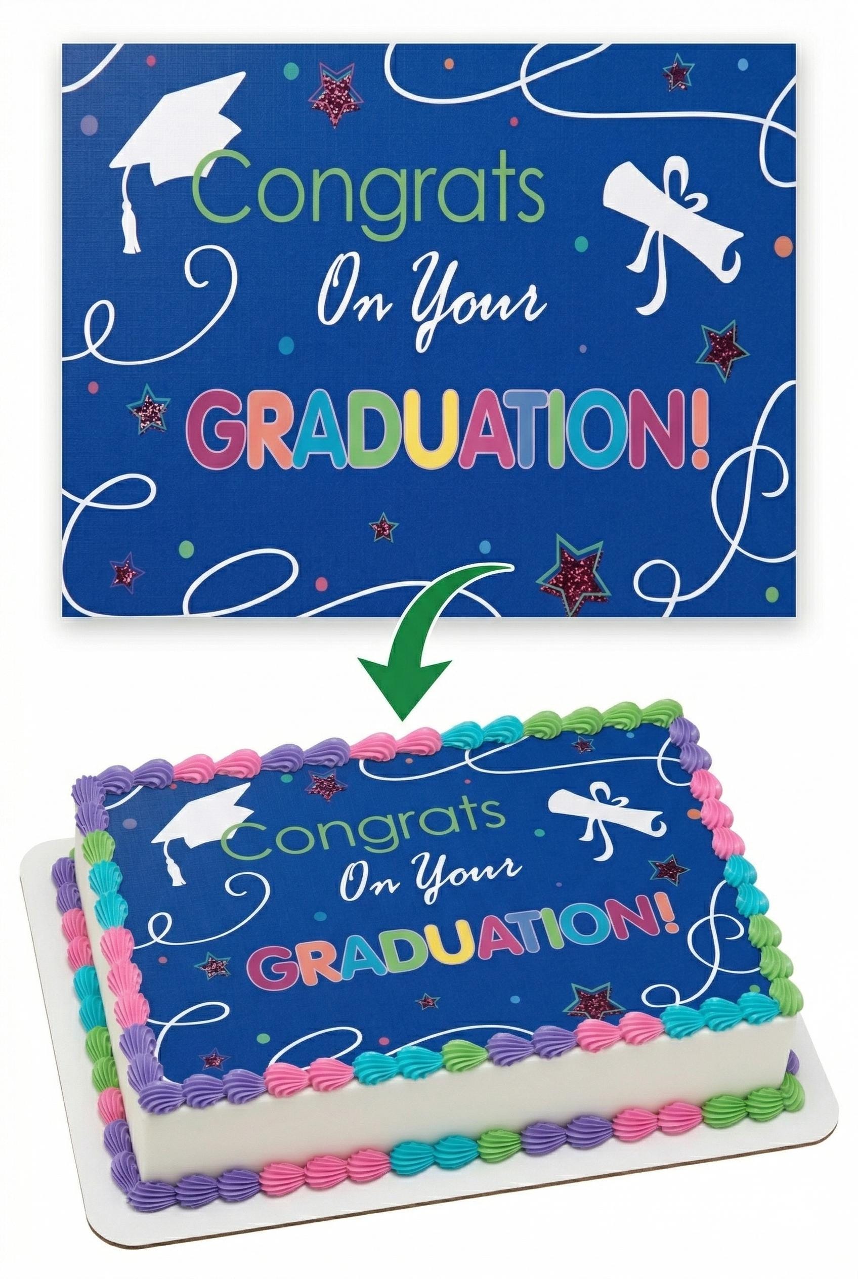 Your edible Congrats On Your Graduation cake topper arrives printed exactly as pictured on a premium fondant frosting sheet (cake not included). Featuring a bright blue graduation design with colorful rainbow lettering and festive details — this cheerful topper adds a fun, vibrant touch to any graduation dessert and helps make the celebration feel even more special. Simply peel, trim, and place on any frosted dessert — it's that easy. Each edible image is made to order and printed with vibrant, food-safe edible ink on a high-quality icing sheet that blends seamlessly into buttercream, fondant, royal icing, or whipped frosting.
