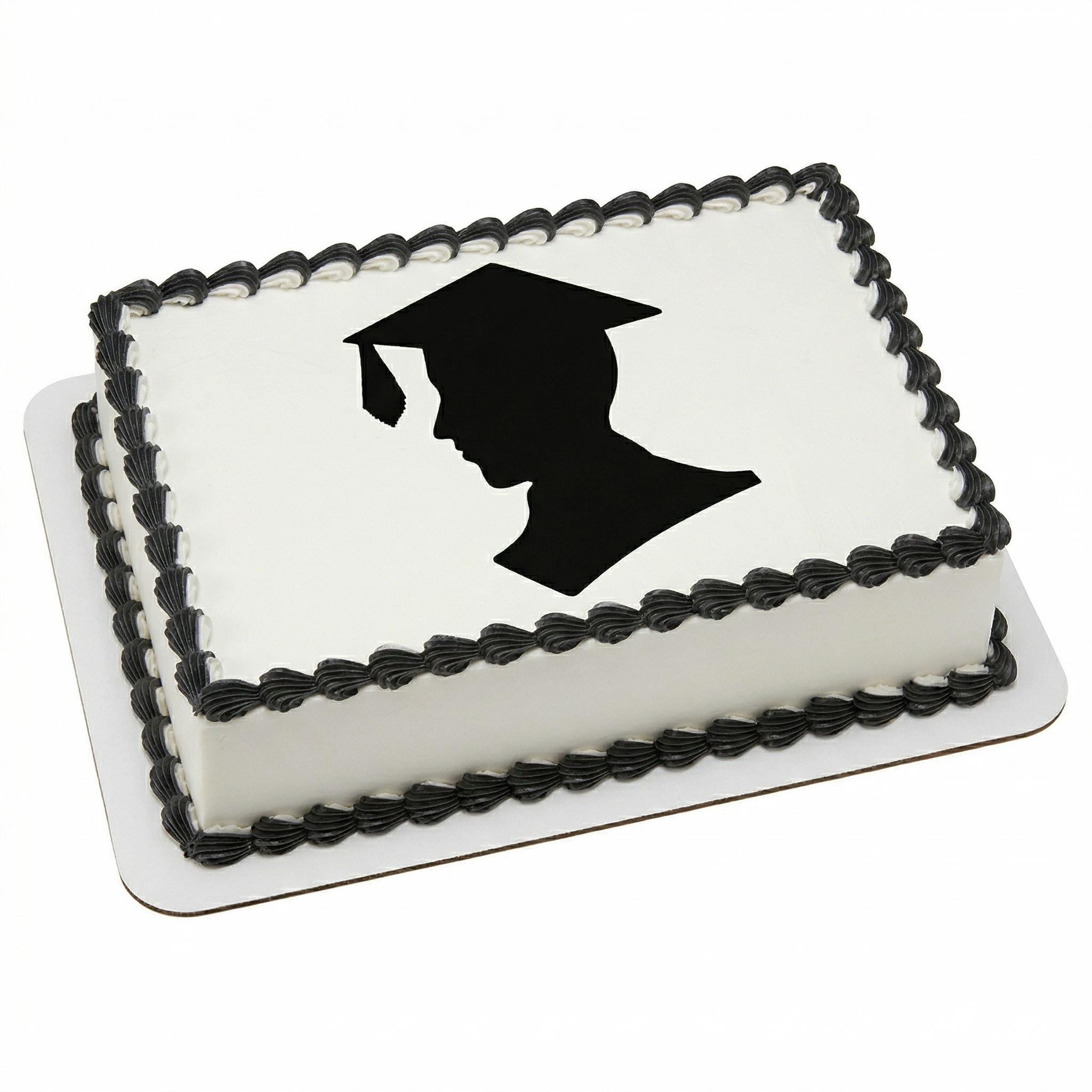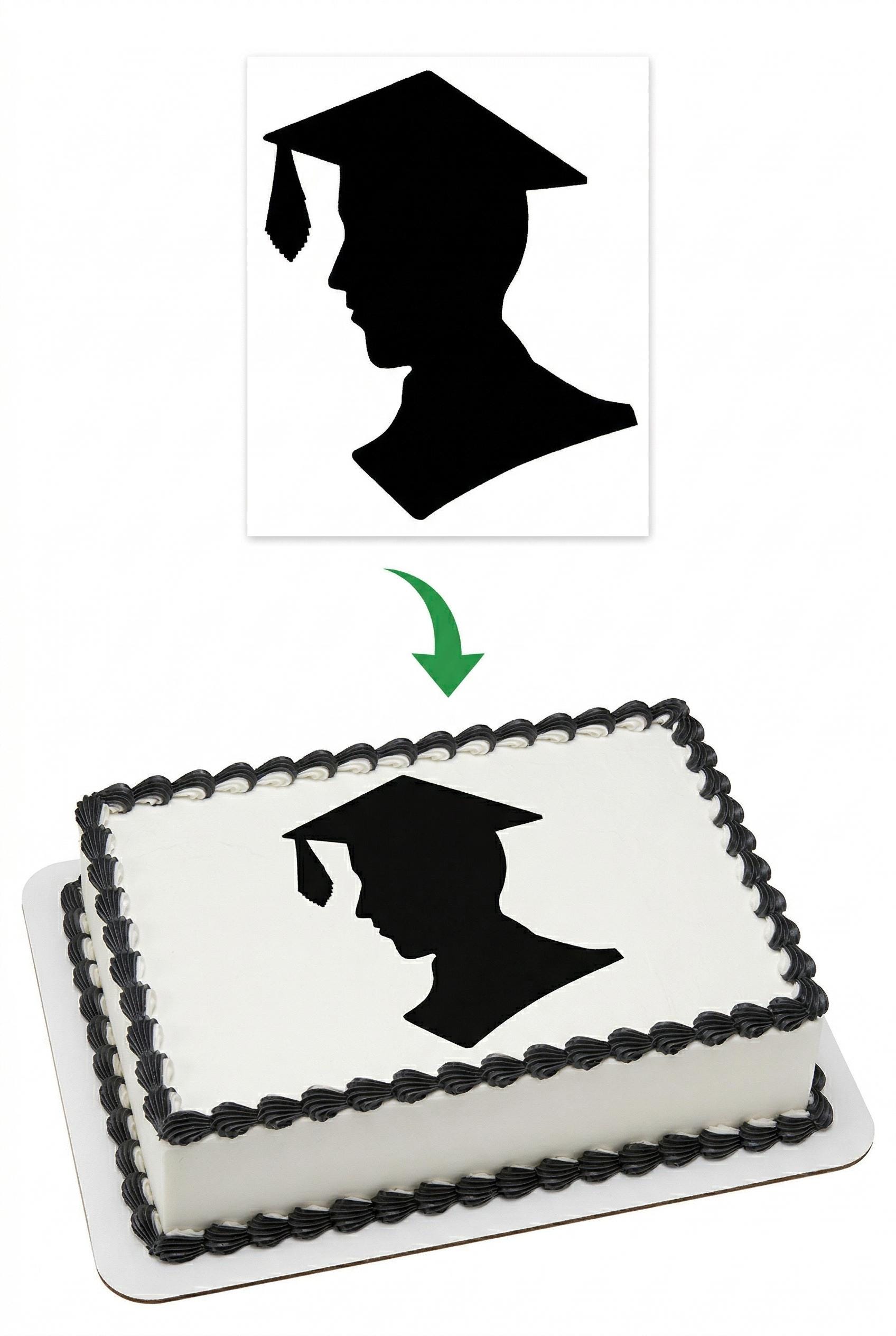 Your edible male graduate silhouette cake topper arrives printed exactly as pictured on a premium fondant frosting sheet (cake not included). Featuring a bold silhouette of a boy graduate wearing a cap and gown — this design adds a classic and memorable touch to any graduation dessert while celebrating his big achievement in style. Simply peel, trim, and place on any frosted dessert — it's that easy. Each edible image is made to order and printed with vibrant, food-safe edible ink on a high-quality icing sheet that blends seamlessly into buttercream, fondant, royal icing, or whipped frosting.