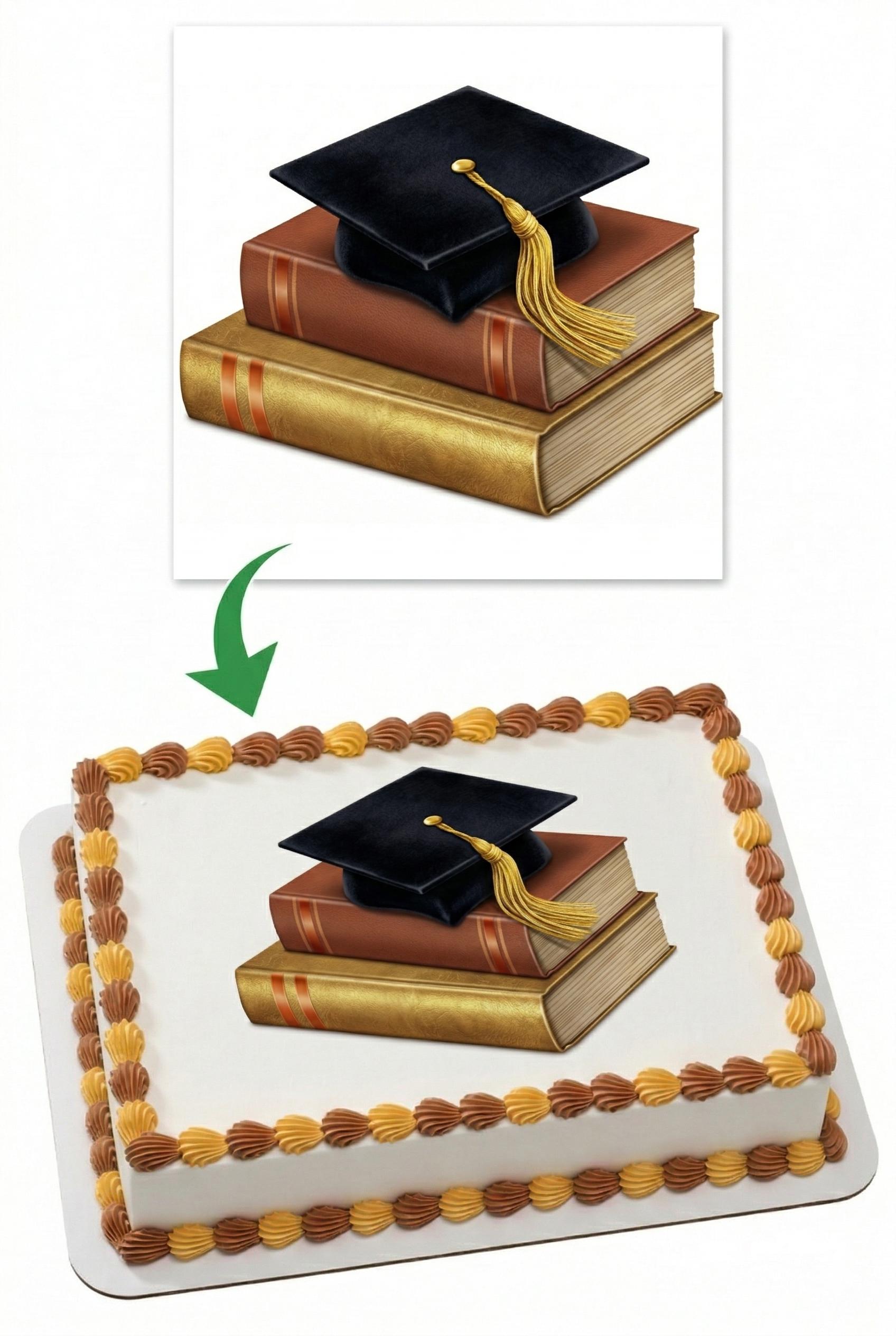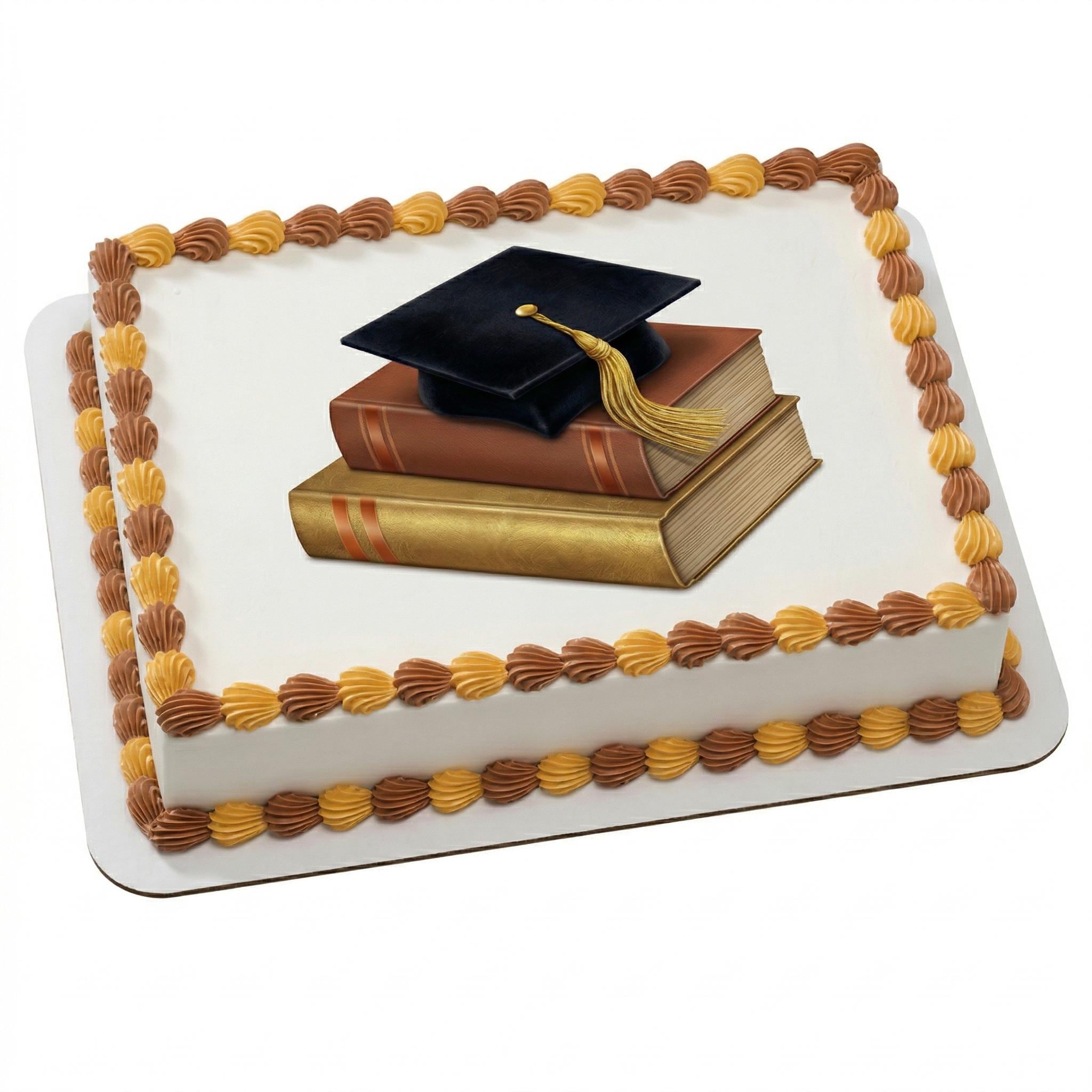 Graduation Cap on Books Edible Cake Topper — Classic Graduation Design with Mortarboard on Stacked Books Printed on Premium Frosting Sheet for Cakes, Cupcakes & Cookies. Perfect for Graduation Parties. Free Custom Text!