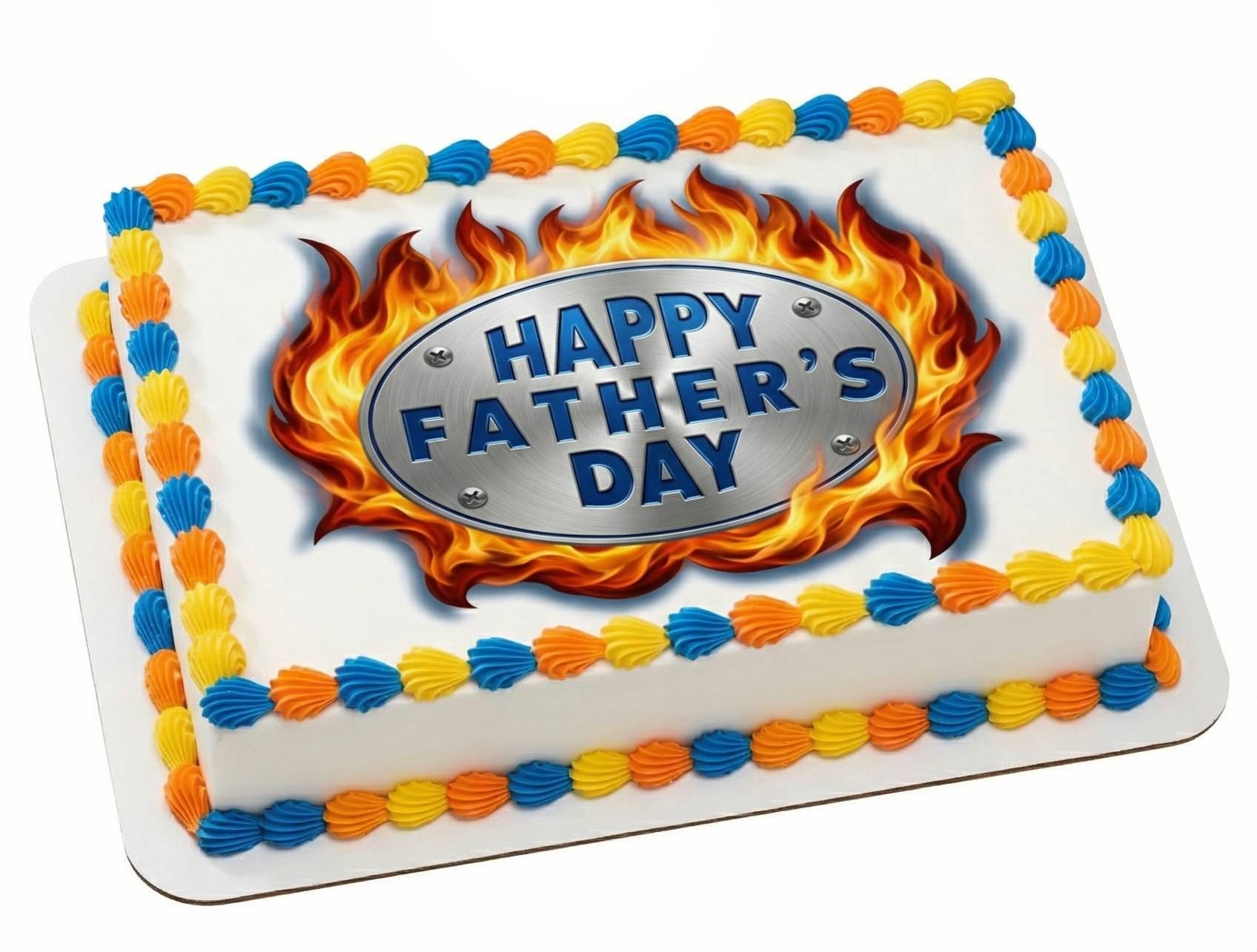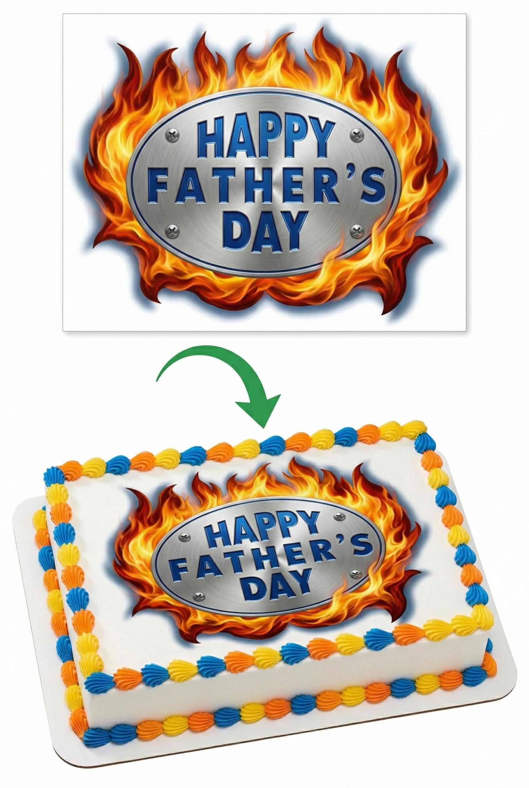 Happy Father’s Day Flames Edible Cake Topper — Bold Metallic Sign Design Printed on Premium Frosting Sheet for Cakes, Cupcakes & Cookies. Celebrate Dad with a Hot Rod Style. Free Custom Text!
