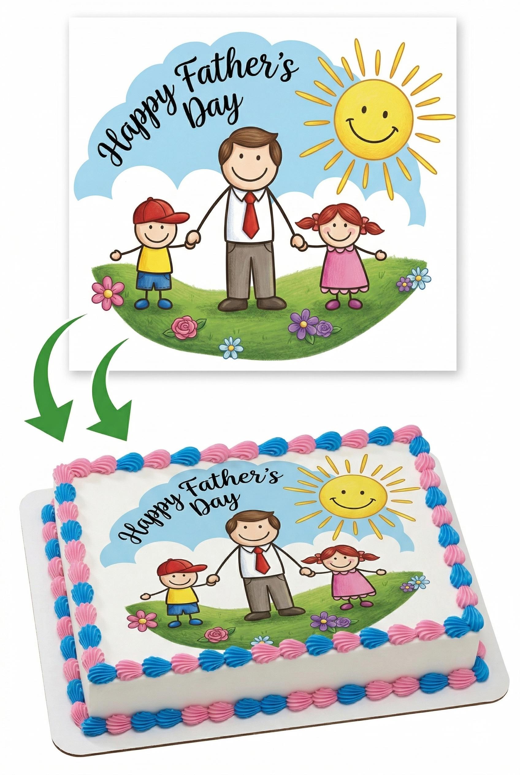 Your edible Father’s Day family cake topper arrives printed exactly as pictured on a premium fondant frosting sheet (cake not included). Featuring a cheerful cartoon-style dad holding hands with two children under a sunny sky with flowers and “Happy Father’s Day” text — this heartwarming design is perfect for celebrating Dad, Grandpa, or any special father figure with a sweet family-themed dessert. Simply peel, trim, and place on any frosted dessert — it's that easy. Each edible image is made to order and printed with vibrant, food-safe edible ink on a high-quality icing sheet that blends seamlessly into buttercream, fondant, royal icing, or whipped frosting.