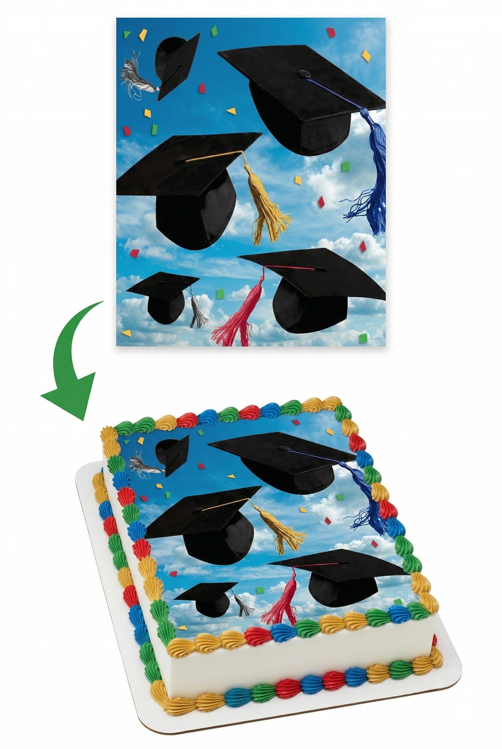 Graduation Caps Tossed in Sky Edible Cake Topper — Colorful Graduation Design with Flying Caps and Confetti Printed on Premium Frosting Sheet for Cakes, Cupcakes & Cookies. Perfect for Graduation Parties. Free Custom Text!