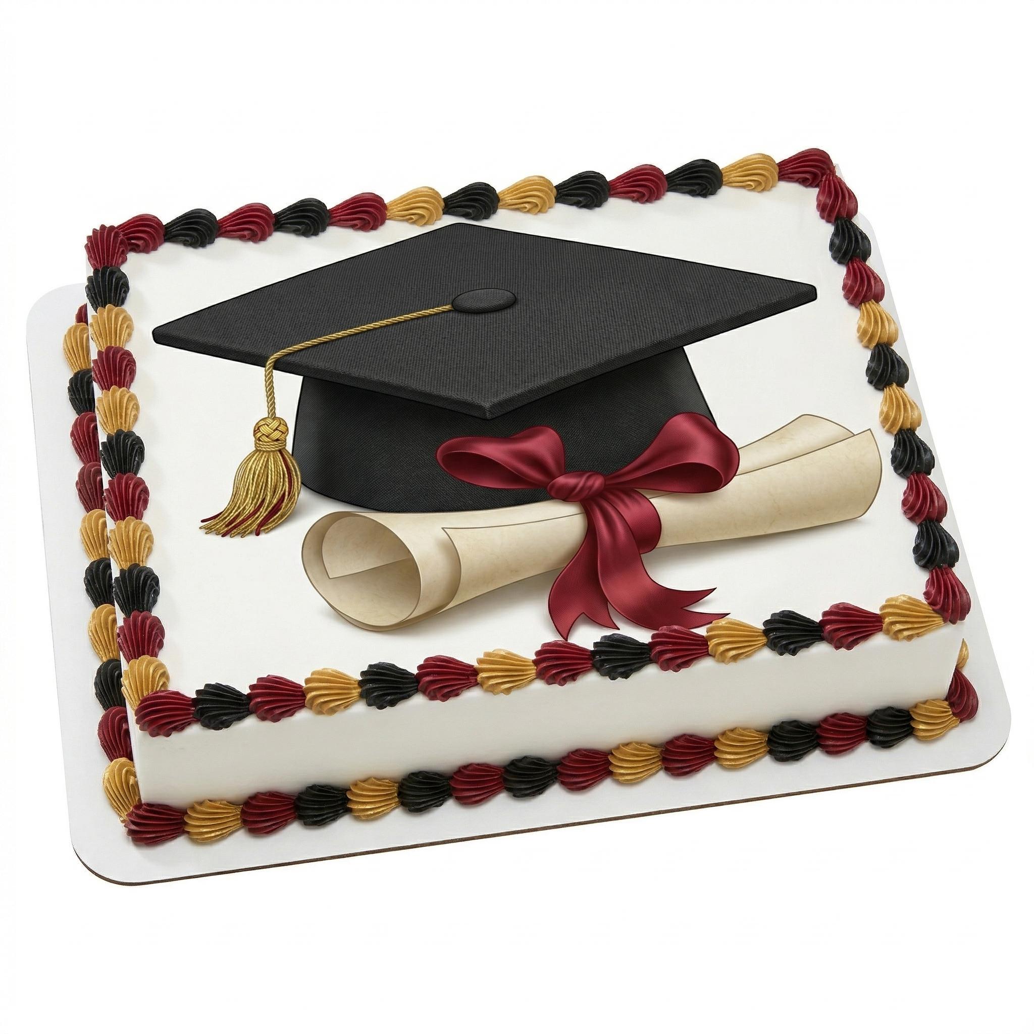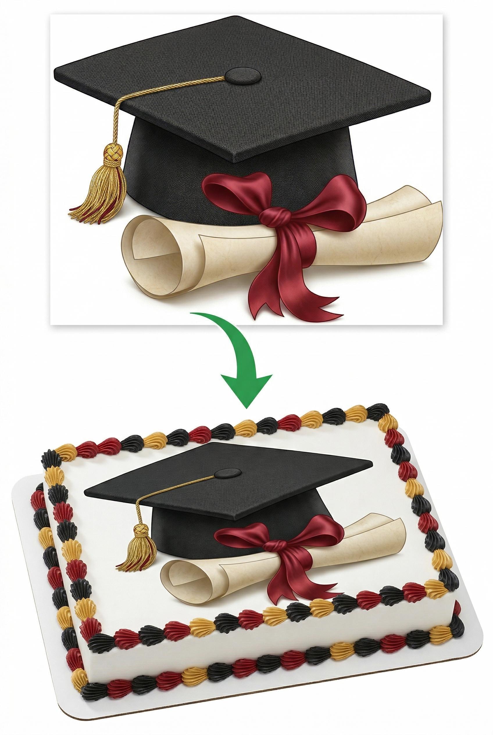 Black Grad Cap Diploma Maroon Ribbon Edible Cake Topper — Graduation Design with Black Mortarboard, Diploma and Maroon Ribbon Printed on Premium Frosting Sheet for Cakes, Cupcakes & Cookies. Perfect for Graduation Parties. Free Custom Text!