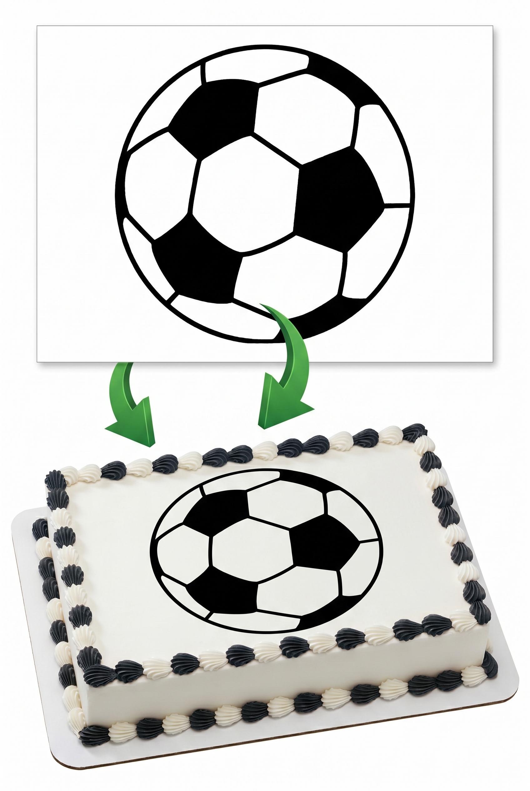 Soccer Ball Edible Cake Topper — Classic Black and White Soccer Ball Design Printed on Premium Frosting Sheet for Cakes, Cupcakes & Cookies. Perfect for Sports Parties and Soccer Fans. Free Custom Text!
