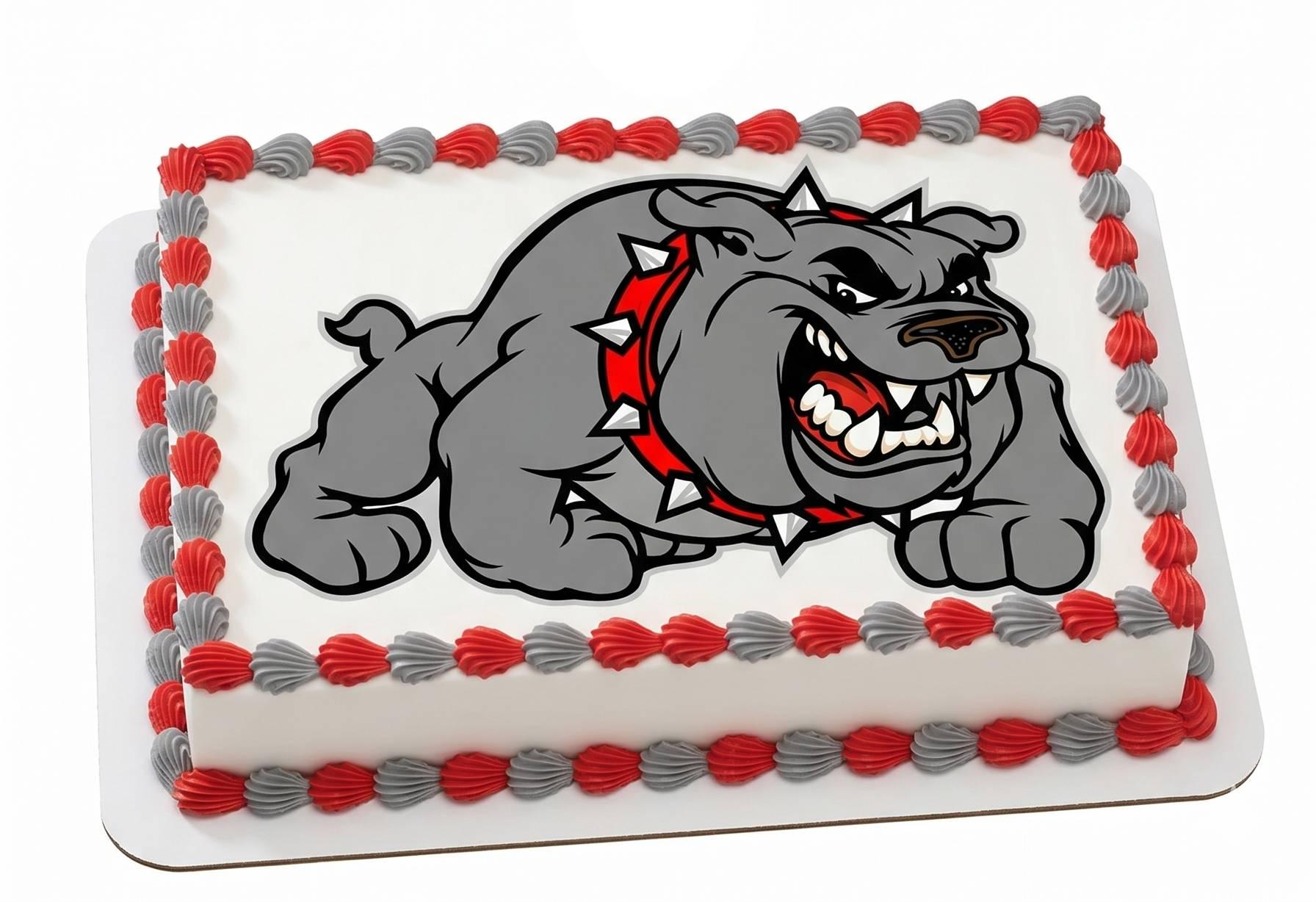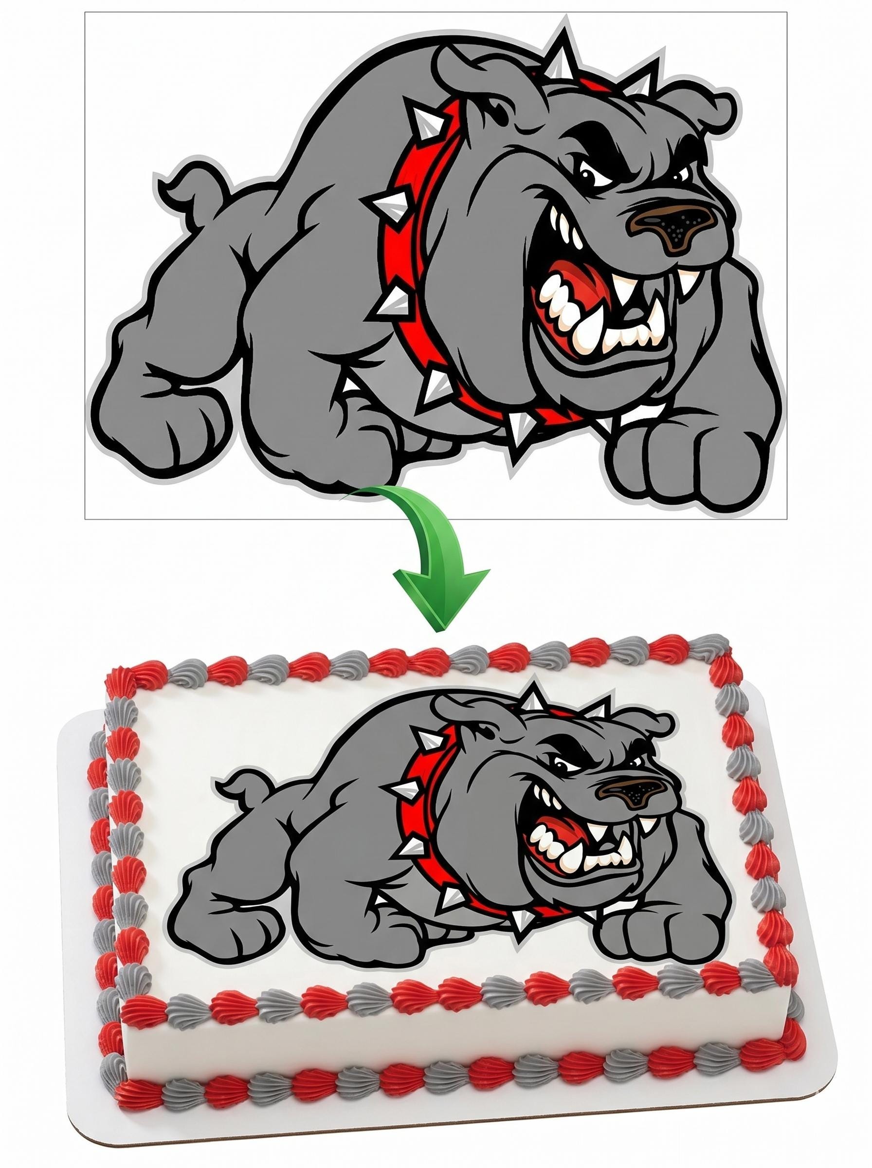 Red Gray Bulldog Mascot Edible Cake Topper — Fierce Full-Body Bulldog Sports Mascot Frosting Sheet Image Printed on Premium Fondant Sheet. Free Custom Text!