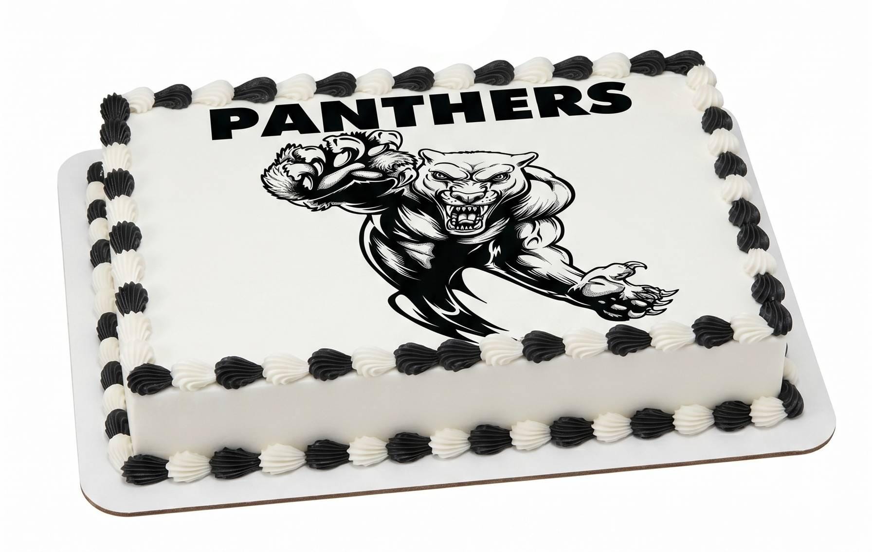 Panthers Mascot Edible Cake Topper — Bold Black and White Panthers Sports Mascot Frosting Sheet Image Printed on Premium Fondant Sheet. Free Custom Text!