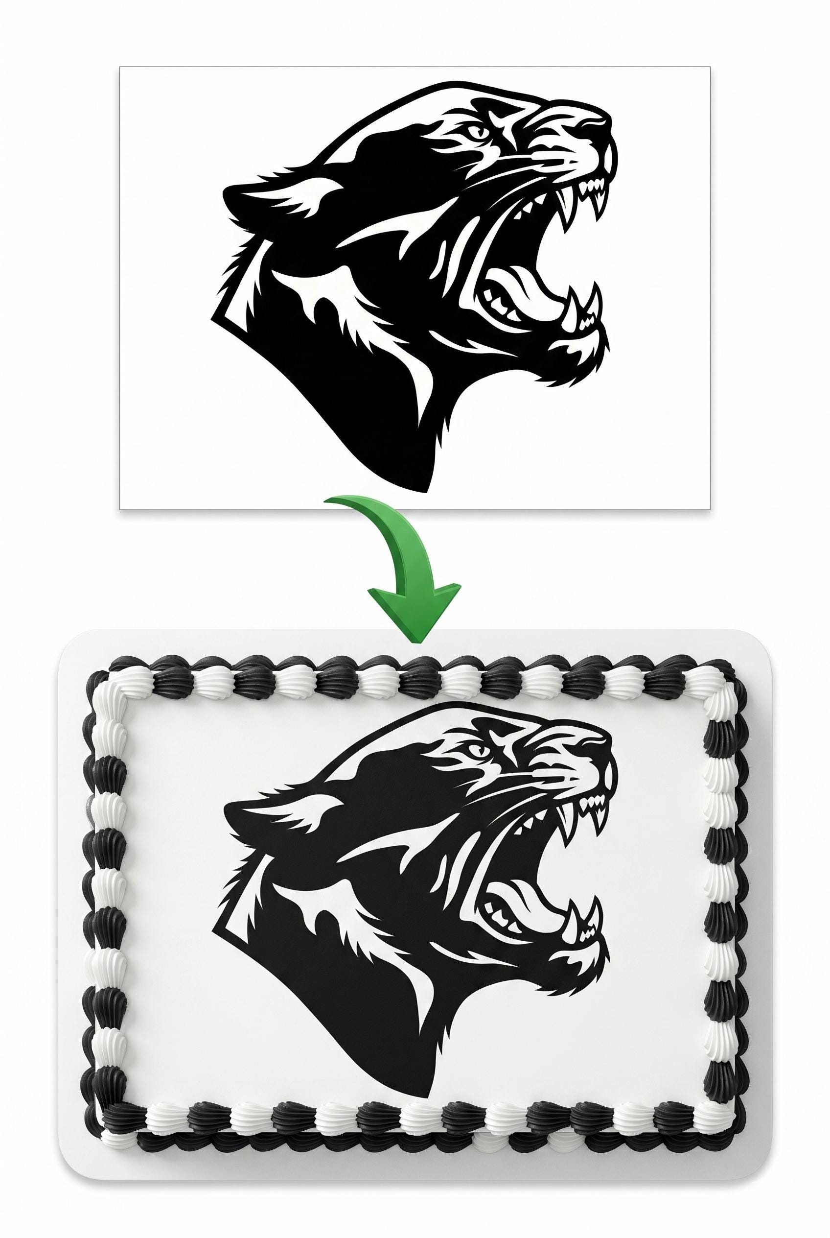 Black Panther Mascot Edible Cake Topper — Bold Black and White Panther Head Sports Mascot Frosting Sheet Image Printed on Premium Fondant Sheet. Free Custom Text!