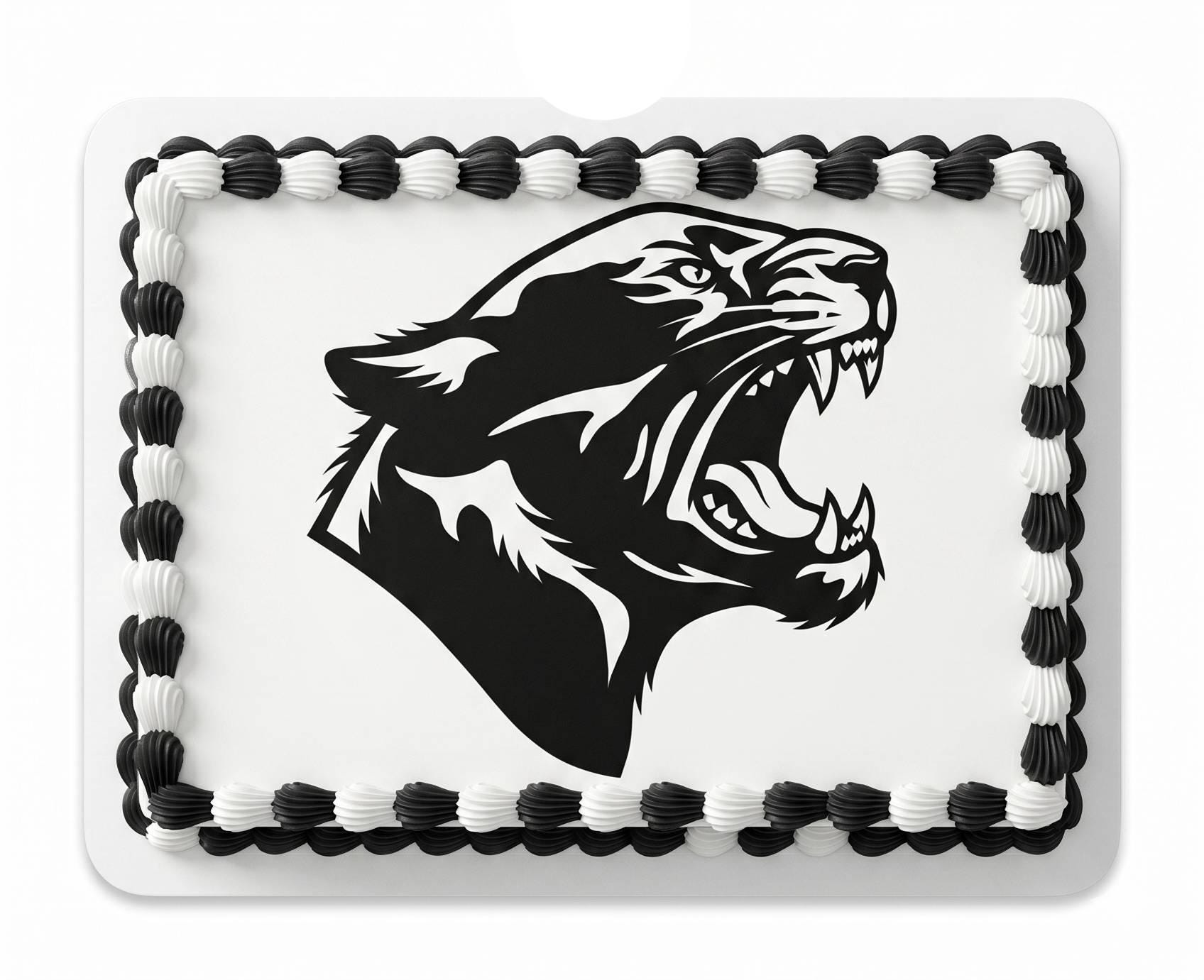 This striking black panther head mascot features a fierce roaring profile with bold graphic styling and sharp fang detail. A perfect fit for school spirit celebrations, team banquets, and any Panthers fan's birthday cake in classic black and white.