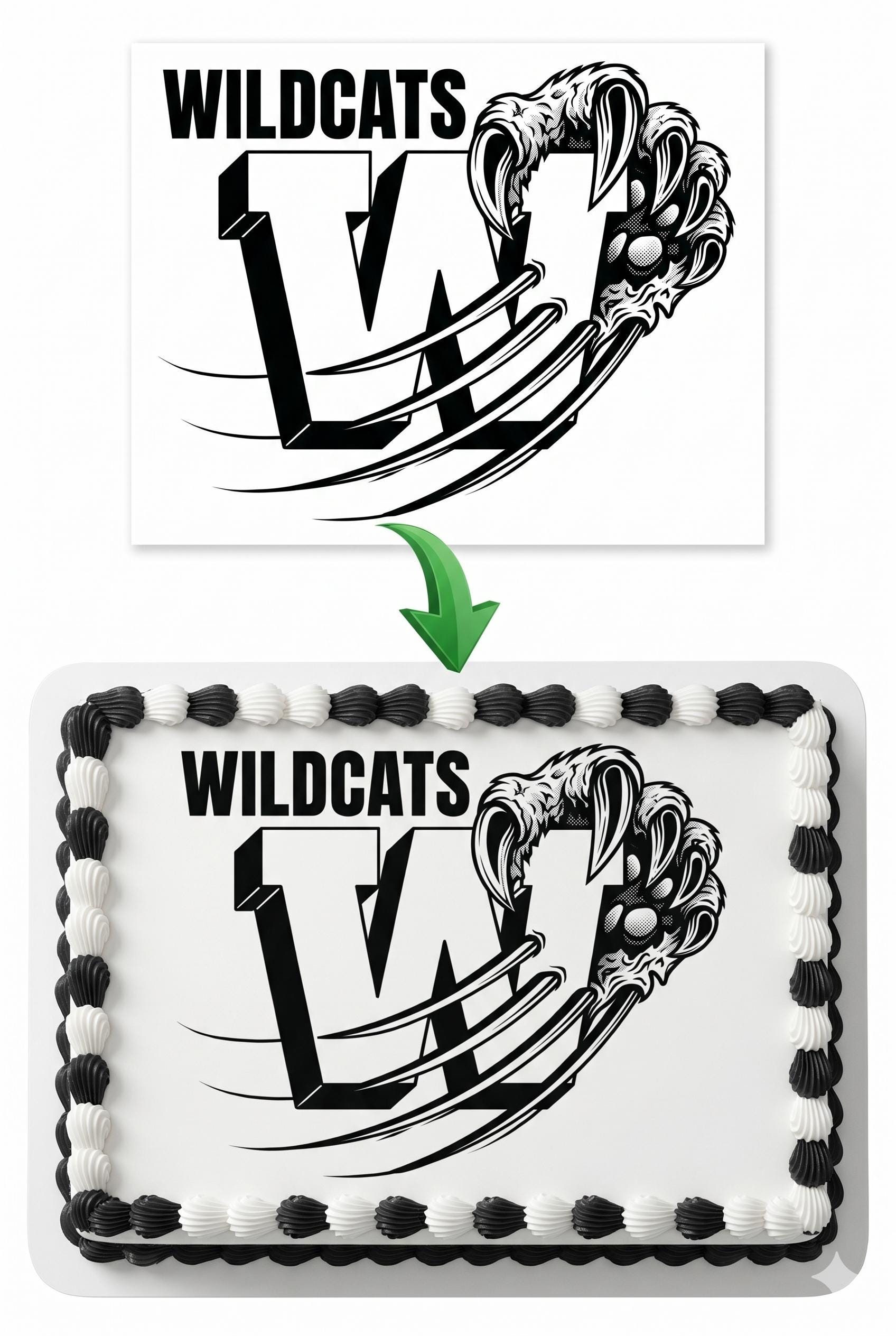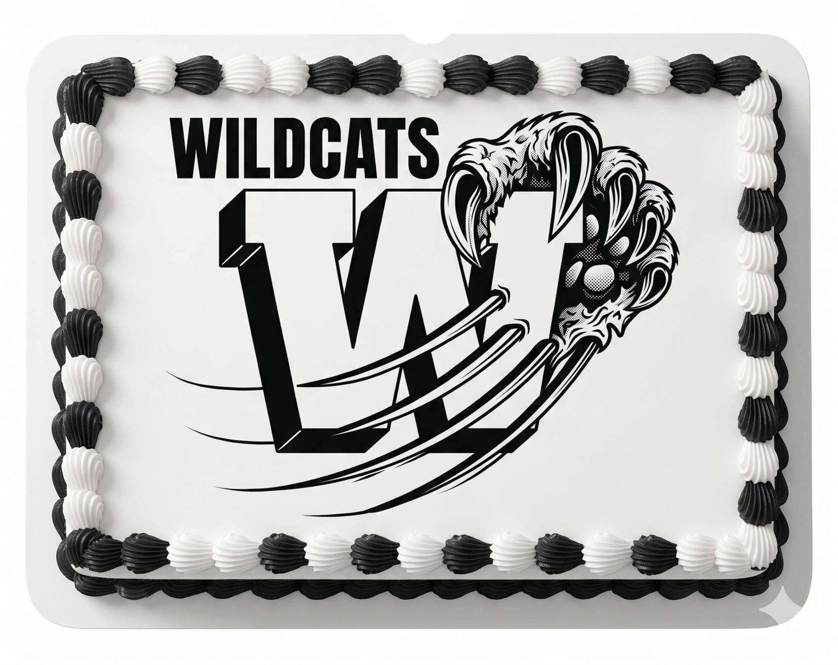 Wildcats Mascot Edible Cake Topper — Bold Black and White Wildcats Logo Frosting Sheet Image Printed on Premium Fondant Sheet. Free Custom Text!This sharp Wildcats logo features a bold "W" letter with a wildcat claw slashing through and "WILDCATS" text in striking black and white. A clean and versatile school spirit design perfect for team banquets, pep rallies, and any Wildcats fan's birthday cake.✦ WHAT YOU GET