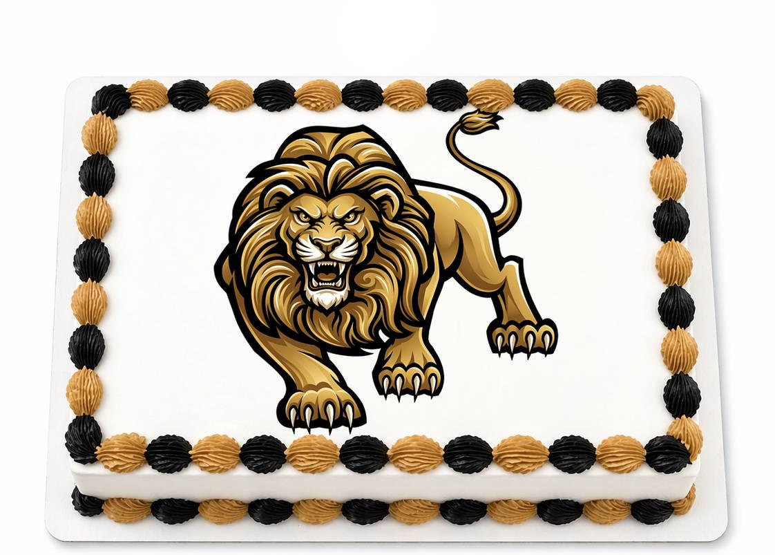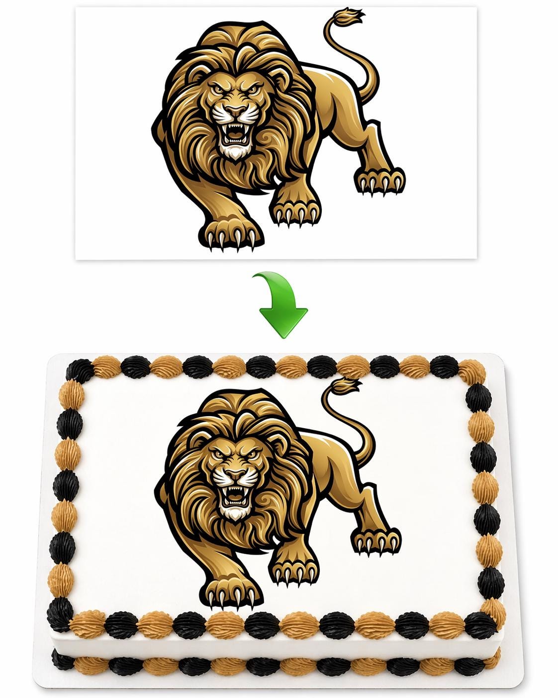 Lion Mascot Edible Cake Topper — Bold Full-Body Gold Lion Sports Mascot Frosting Sheet Image Printed on Premium Fondant Sheet. Free Custom Text!