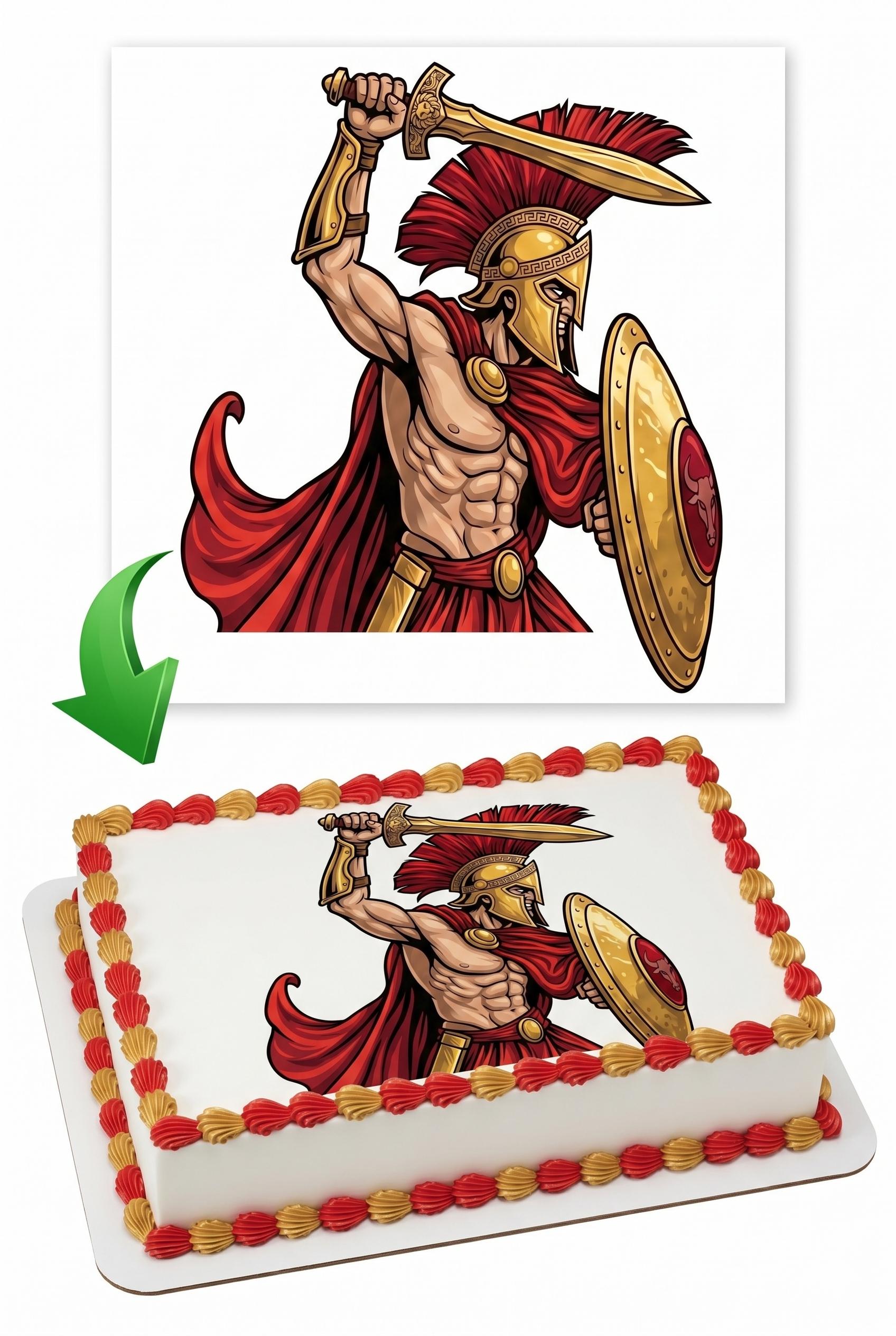 Spartan Warrior Mascot Edible Cake Topper — Bold Red and Gold Spartan Trojan Warrior Frosting Sheet Image Printed on Premium Fondant Sheet. Free Custom Text!
