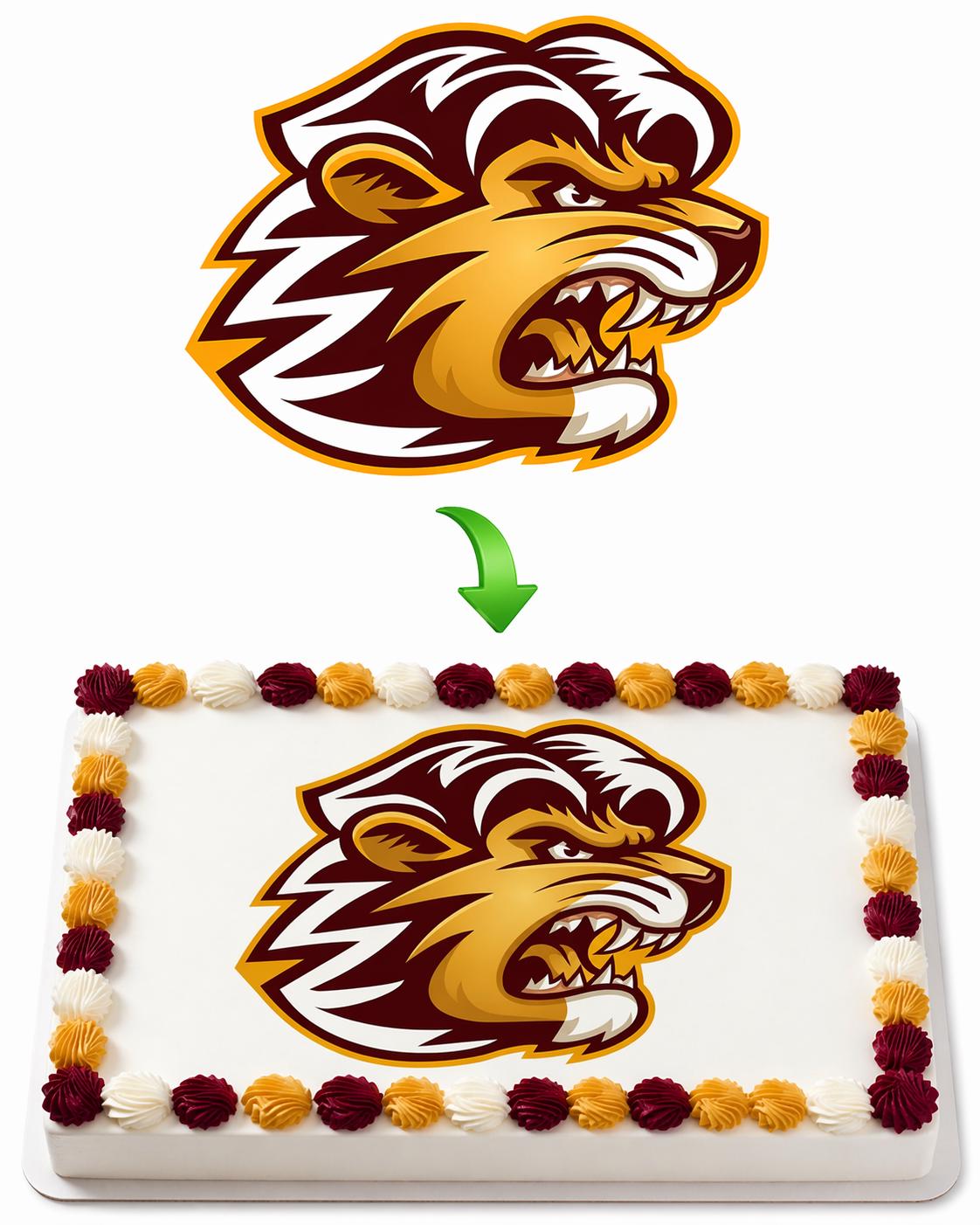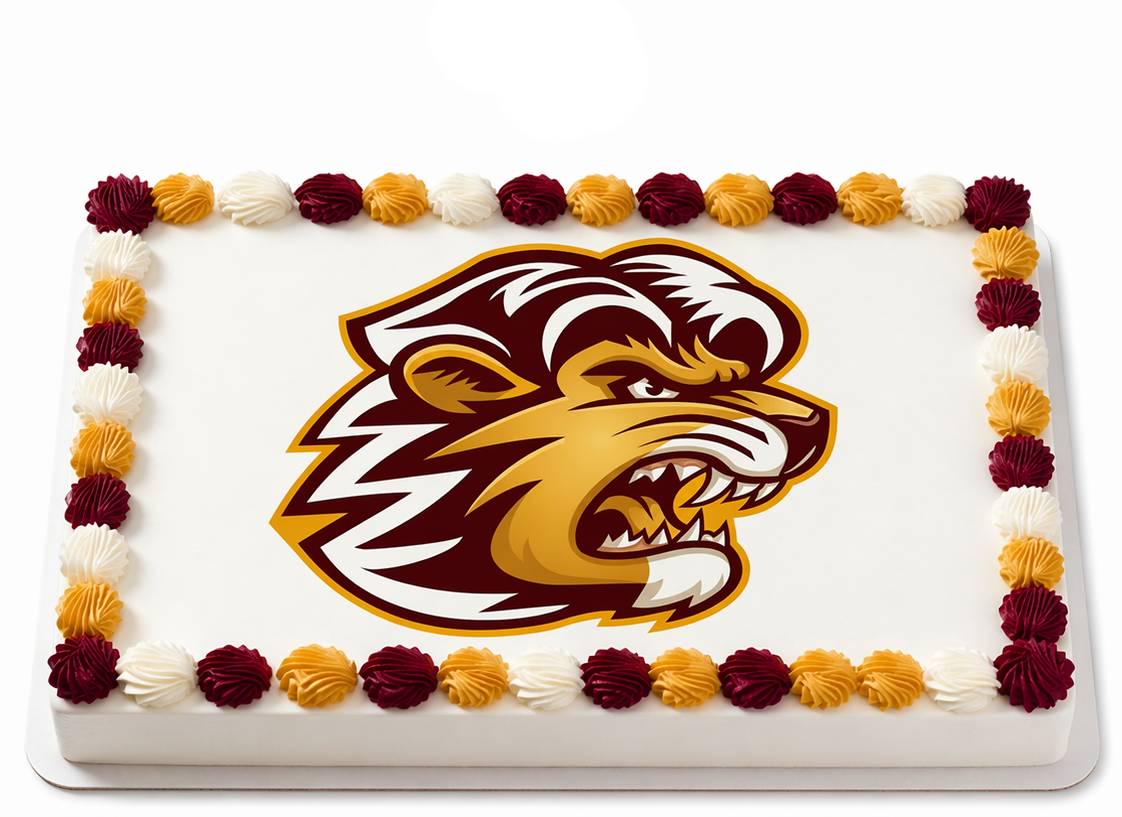 Lion Mascot Edible Cake Topper — Bold Maroon and Gold Lion Sports Mascot Frosting Sheet Image Printed on Premium Fondant Sheet. Free Custom Text!