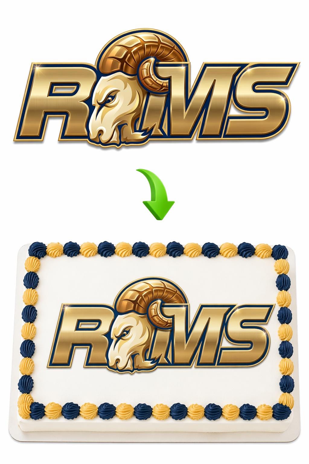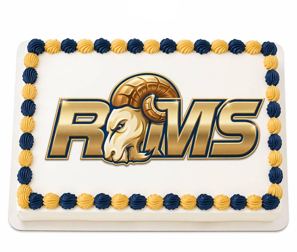 Rams Mascot Edible Cake Topper — Bold Navy and Gold Rams Sports Mascot Logo Frosting Sheet Image Printed on Premium Fondant Sheet. Free Custom Text!