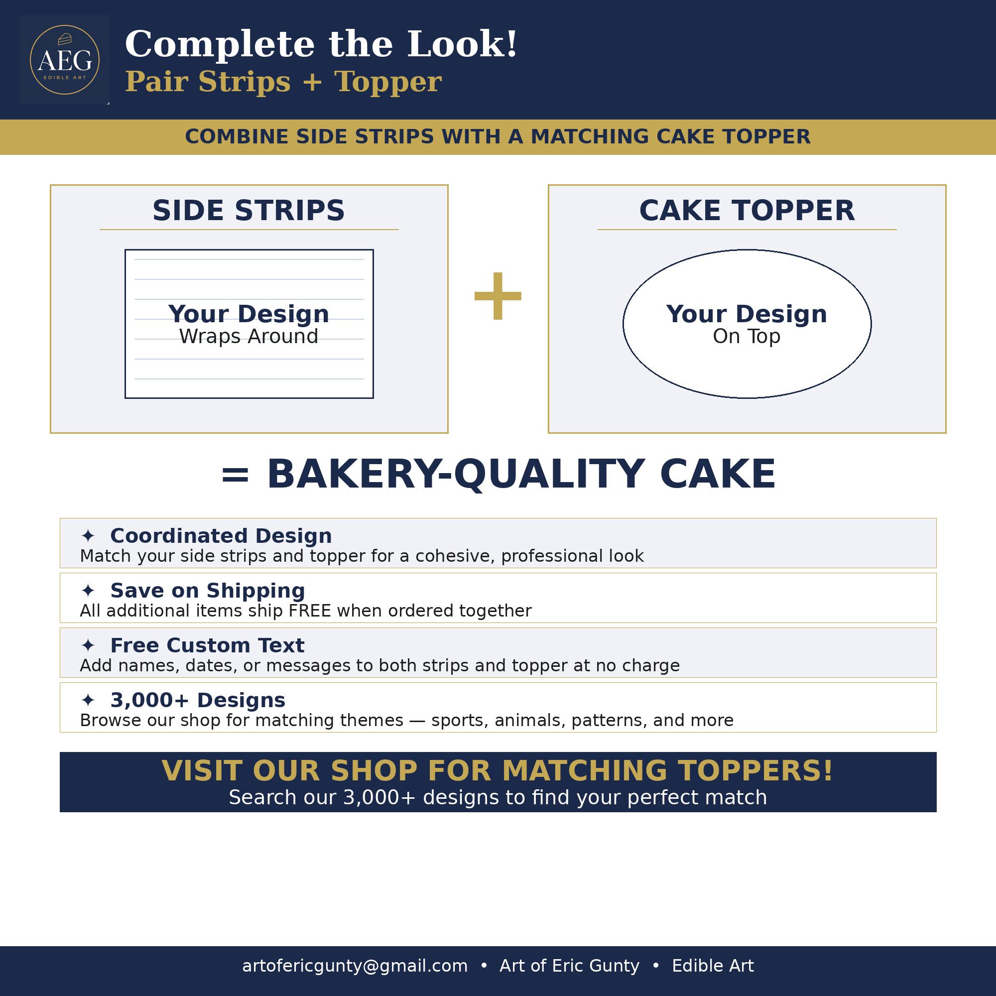 Combine our edible side strips with a matching edible cake topper for a complete, coordinated design. Save on shipping by ordering both at the same time — all additional items ship free!