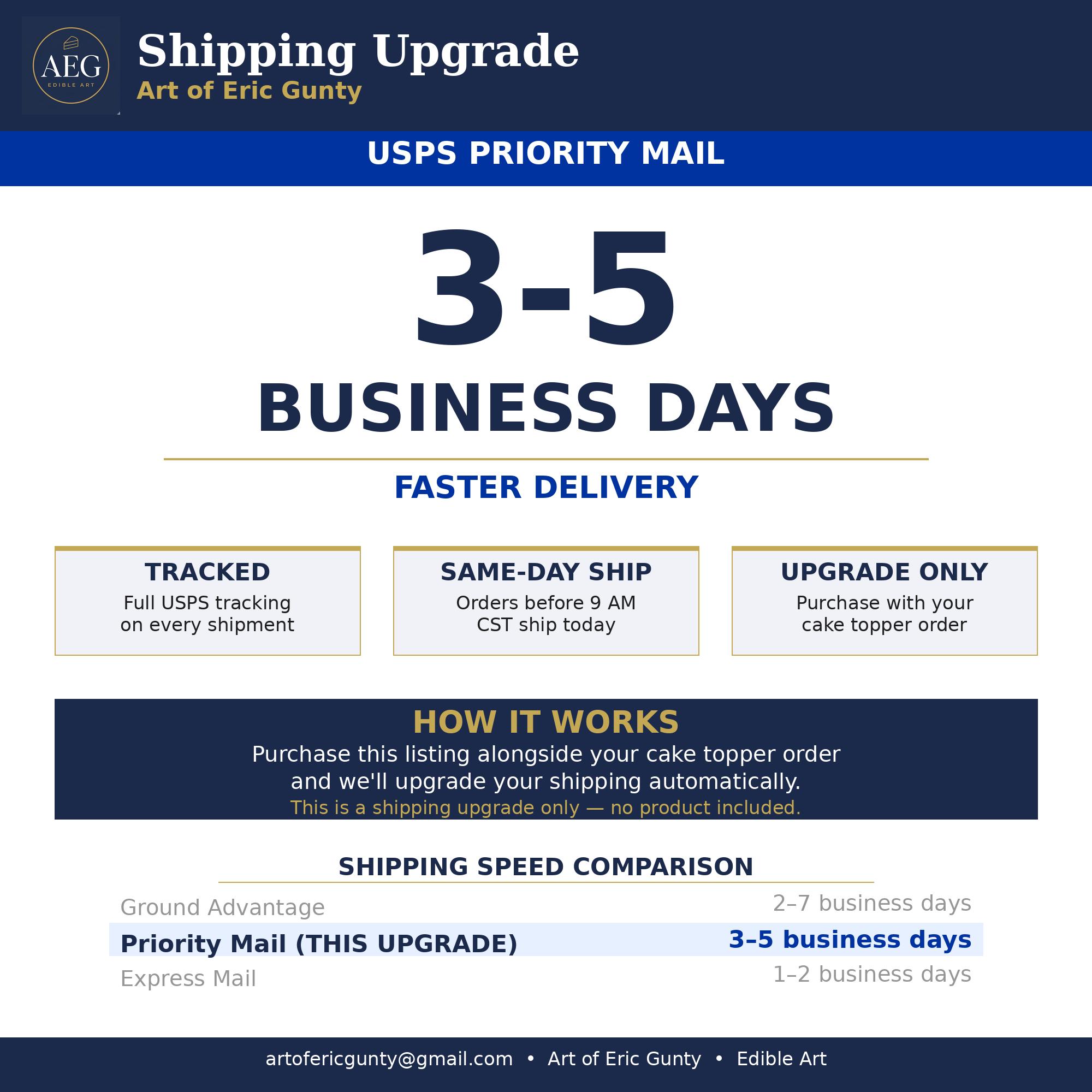 USPS Priority Mail Shipping Upgrade — 3-5 Business Day Delivery. Purchase This to Upgrade an Existing Edible Cake Topper Order to Priority Mail.Need your edible cake topper a little faster? This listing upgrades your shipping to USPS Priority Mail with 3-5 business day delivery. Simply purchase this alongside your cake topper order or after you've already placed an order and we'll upgrade your shipping automatically.✦ HOW IT WORKS