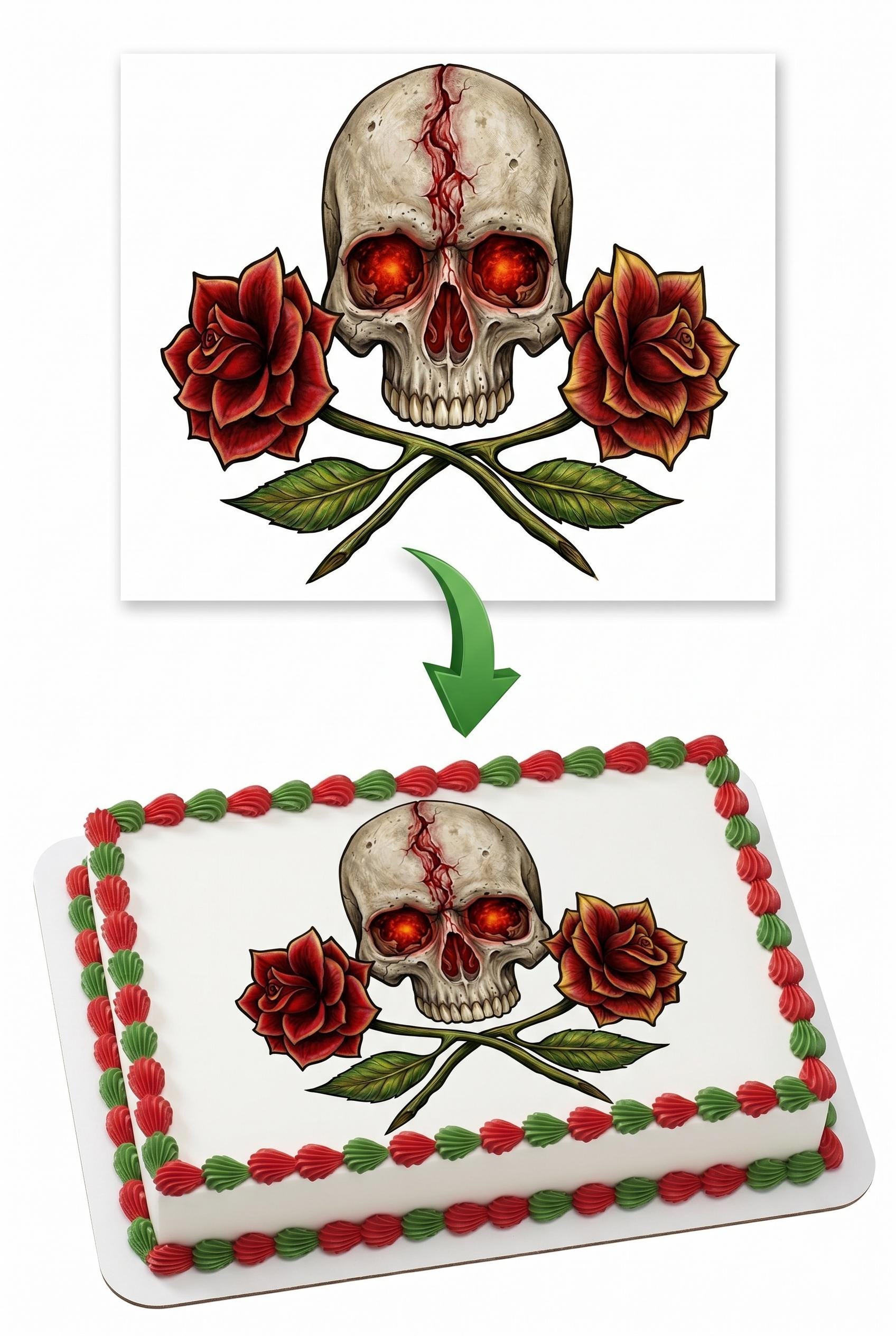 Skull and Red Roses Edible Cake Topper — Gothic Skull with Fiery Eyes and Rose Design Printed on Premium Frosting Sheet for Cakes, Cupcakes & Cookies. Perfect for Halloween and Alternative Celebrations. Free Custom Text!