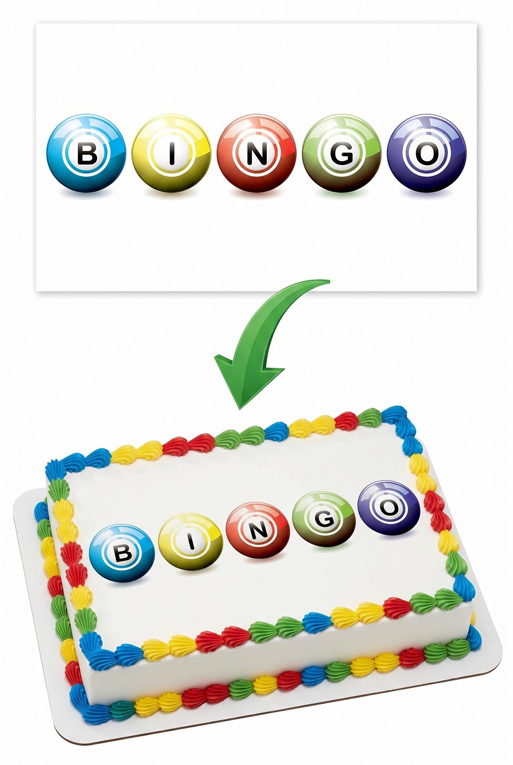 Bingo Balls Edible Cake Topper — Colorful Letter Ball Design Printed on Premium Frosting Sheet for Cakes, Cupcakes & Cookies. Perfect for Bingo Fans. Free Custom Text!