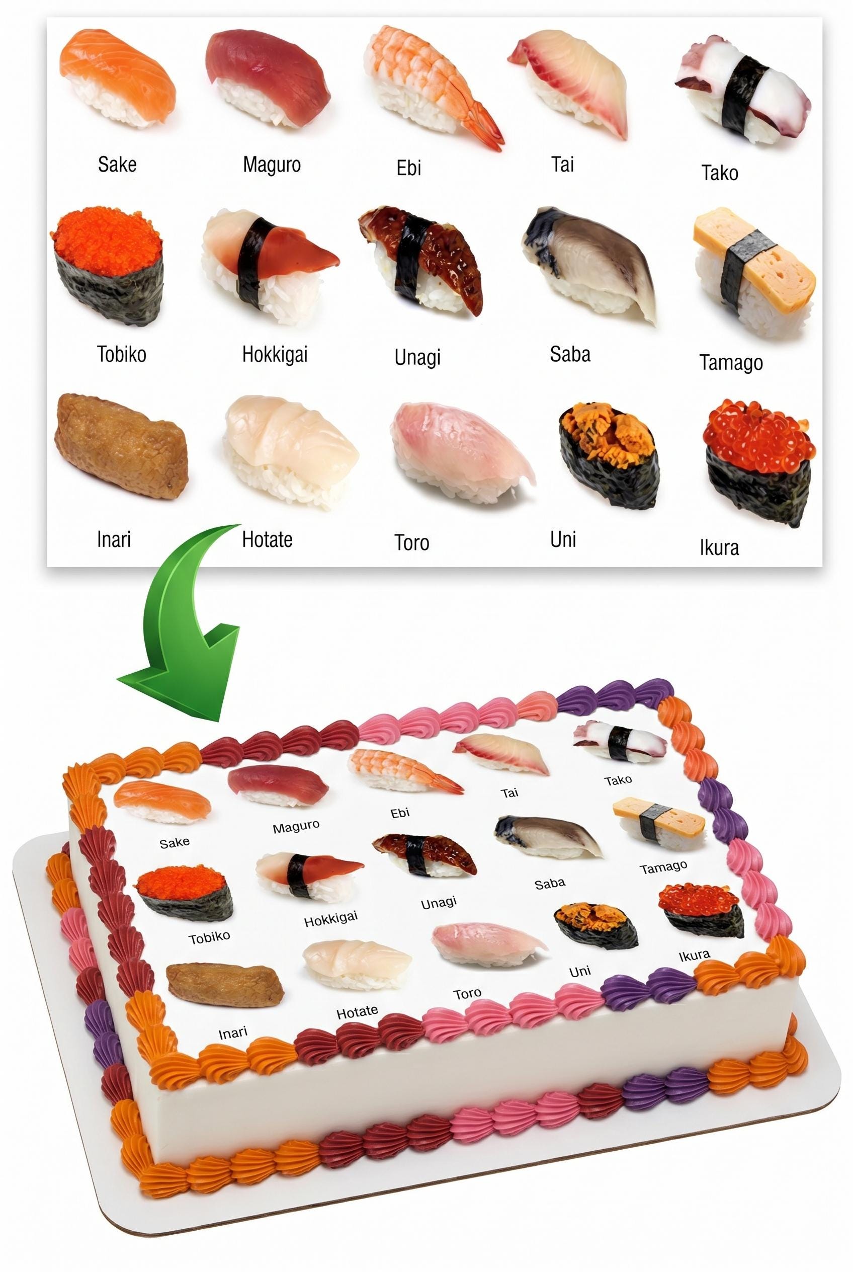 Sushi Guide Edible Cake Topper — Assorted Nigiri and Sushi Names Chart Design Printed on Premium Frosting Sheet for Cakes, Cupcakes & Cookies. Perfect for Sushi Lovers and Japanese Food Parties. Free Custom Text!