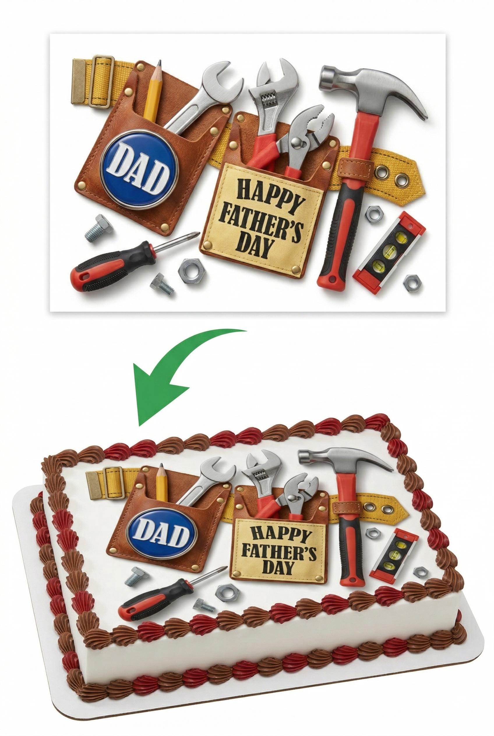 Your edible Father’s Day tool belt cake topper arrives printed exactly as pictured on a premium fondant frosting sheet (cake not included). Featuring a realistic tool belt filled with handyman tools like a hammer, wrench, pliers, screwdriver, pencil, and level, plus a bold “DAD” emblem and “Happy Father’s Day” sign — this design is the perfect centerpiece for celebrating the fixer, builder, and problem-solver in your life. Simply peel, trim, and place on any frosted dessert — it's that easy. Each edible image is made to order and printed with vibrant, food-safe edible ink on a high-quality icing sheet that blends seamlessly into buttercream, fondant, royal icing, or whipped frosting.
