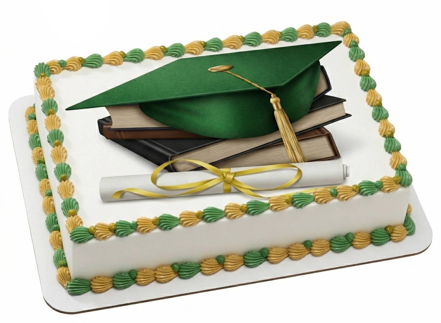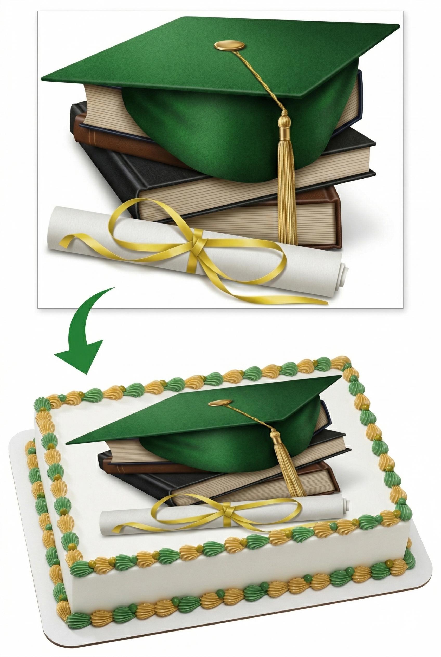 Your edible graduation cap books cake topper arrives printed exactly as pictured on a premium fondant frosting sheet (cake not included). Featuring a classic green graduation cap with a gold tassel resting on stacked books beside a rolled diploma — this academic design symbolizes hard work, learning, and achievement while adding a polished school-color look to any graduation dessert. Simply peel, trim, and place on any frosted dessert — it's that easy. Each edible image is made to order and printed with vibrant, food-safe edible ink on a high-quality icing sheet that blends seamlessly into buttercream, fondant, royal icing, or whipped frosting.