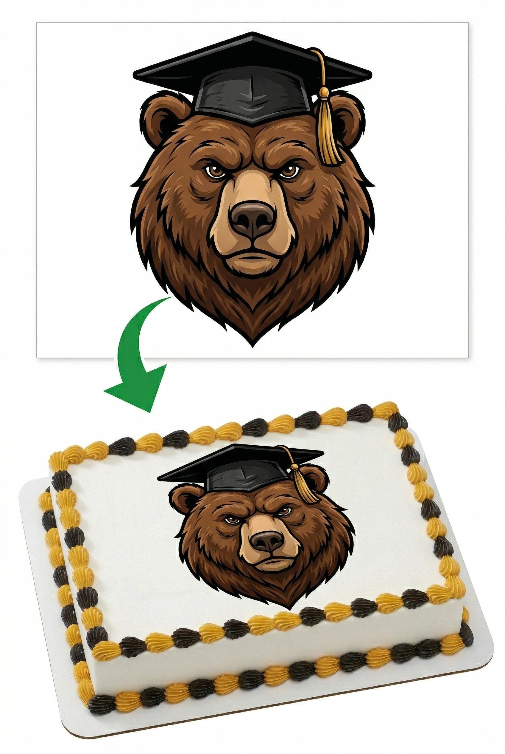 Bear Graduation Cap Mascot Edible Cake Topper — a powerful school spirit graduation design perfect for commencement parties, open houses, and celebration desserts! Features a strong brown bear face wearing a black graduation cap with gold tassel, printed in stunning detail on a premium frosting sheet. Perfect for any school with a bear, grizzly, or bruin mascot. Available in 9 size options to fit any cake, cupcake, or dessert.