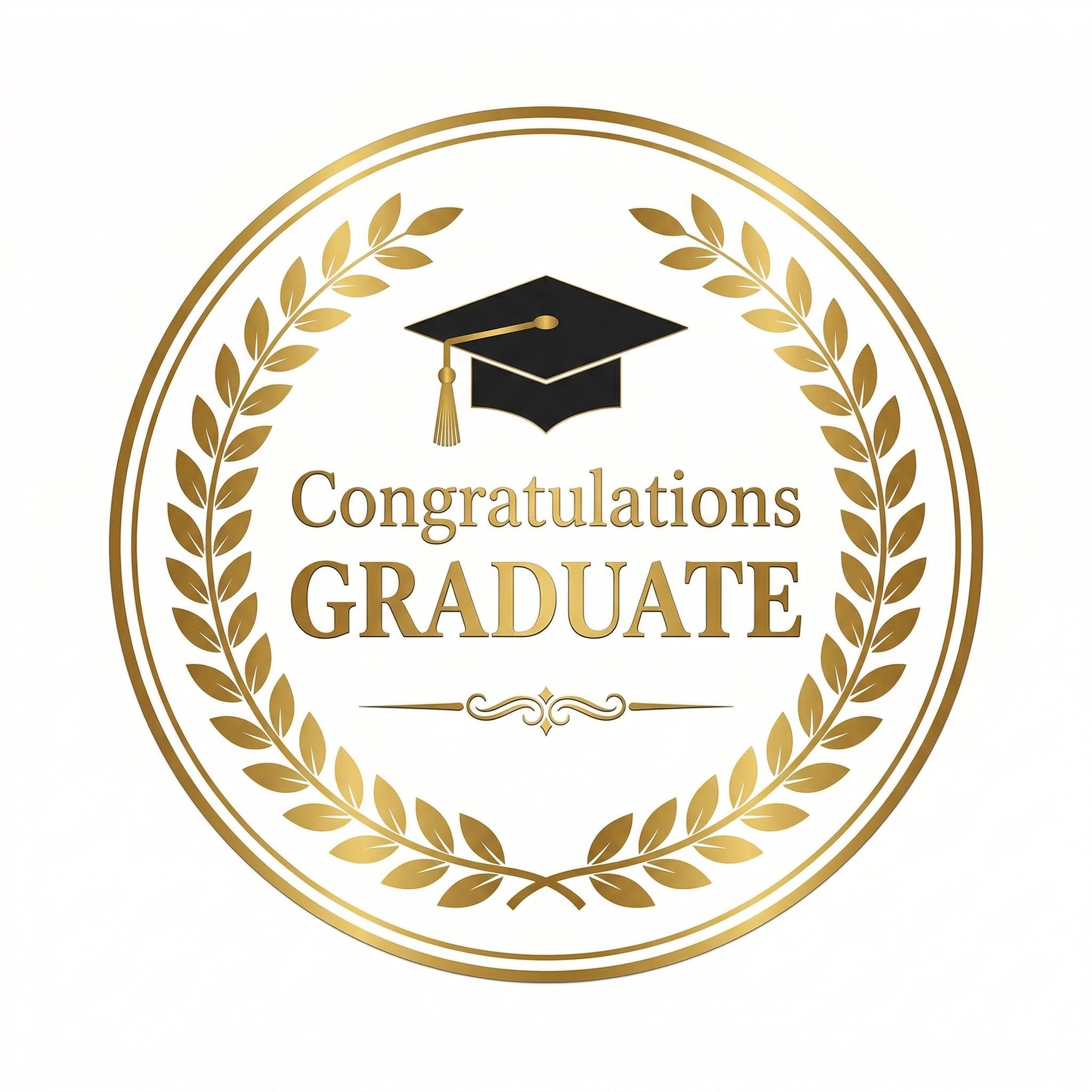 An elegant gold laurel wreath Congratulations Graduate emblem — the most sophisticated graduation edible cake topper in our collection. This premium circular design features golden laurel branches, a mortarboard cap icon, and classic typography in black and gold. The timeless color scheme coordinates with every party decor style and works equally well for high school, college, and graduate school milestones. Printed on premium frosting sheets with rich food-safe inks that give the gold tones a luxurious finish. Personalize free with a name, degree, or graduation year. Choose from 8 sizes: half sheet, quarter sheet, 8" round, 6" round, 3" round (6 per sheet), 2.5" round (12 per sheet), 2" round (15 per sheet), or 3"x2" ovals (8 per sheet). Peel and place on any frosted surface. Stays fresh up to 12 months sealed. Allergen-friendly. Ships flat with care instructions. SKU D30016.