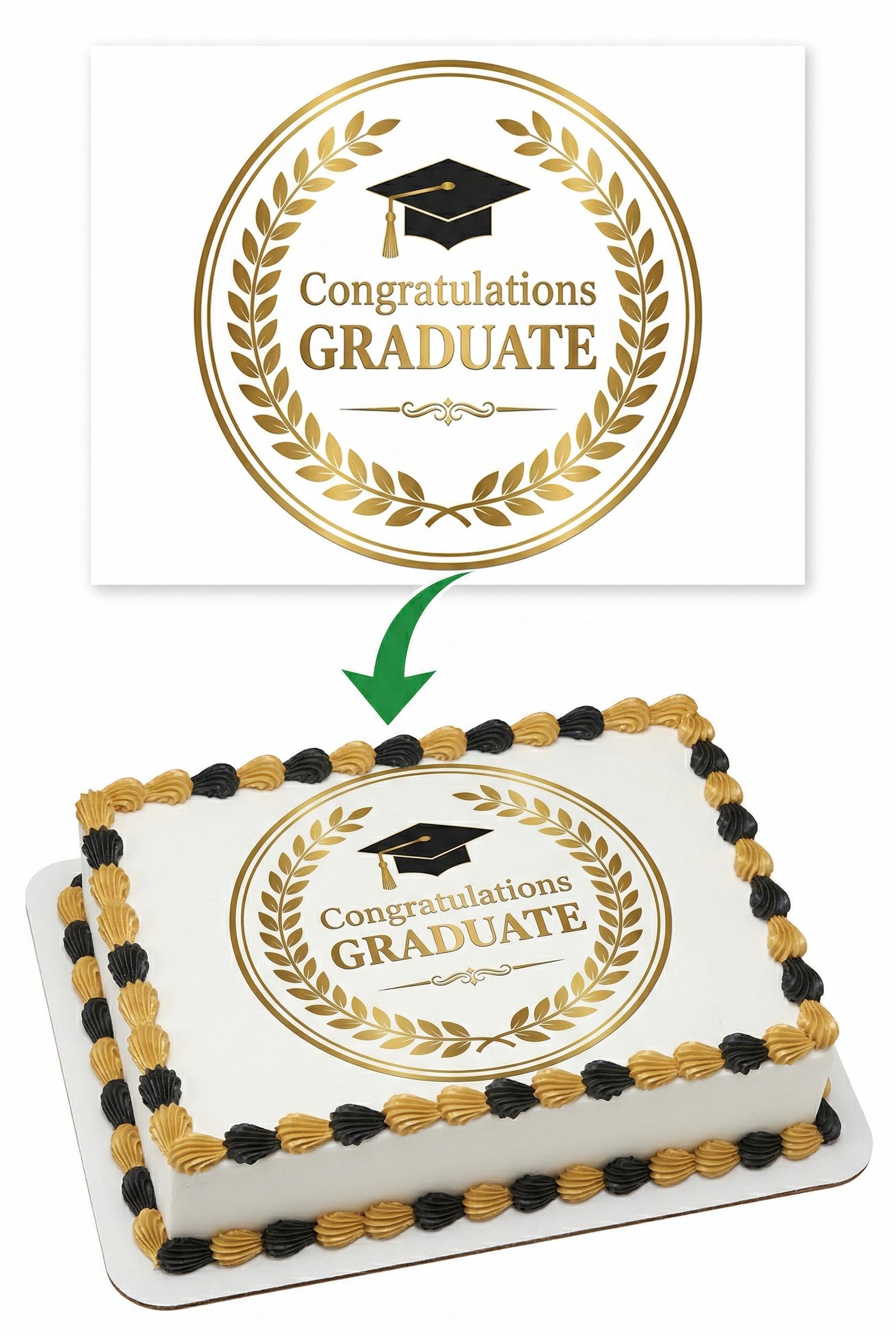 Congratulations Graduate Gold Laurel Wreath Edible Cake Topper — an elegant and sophisticated graduation design perfect for commencement parties, open houses, and celebration desserts! Features a black graduation cap centered in a gold laurel wreath with "Congratulations Graduate" lettering, printed in rich gold and black detail on a premium frosting sheet. A polished, upscale look for any grad celebration. Available in 9 size options to fit any cake, cupcake, or dessert.