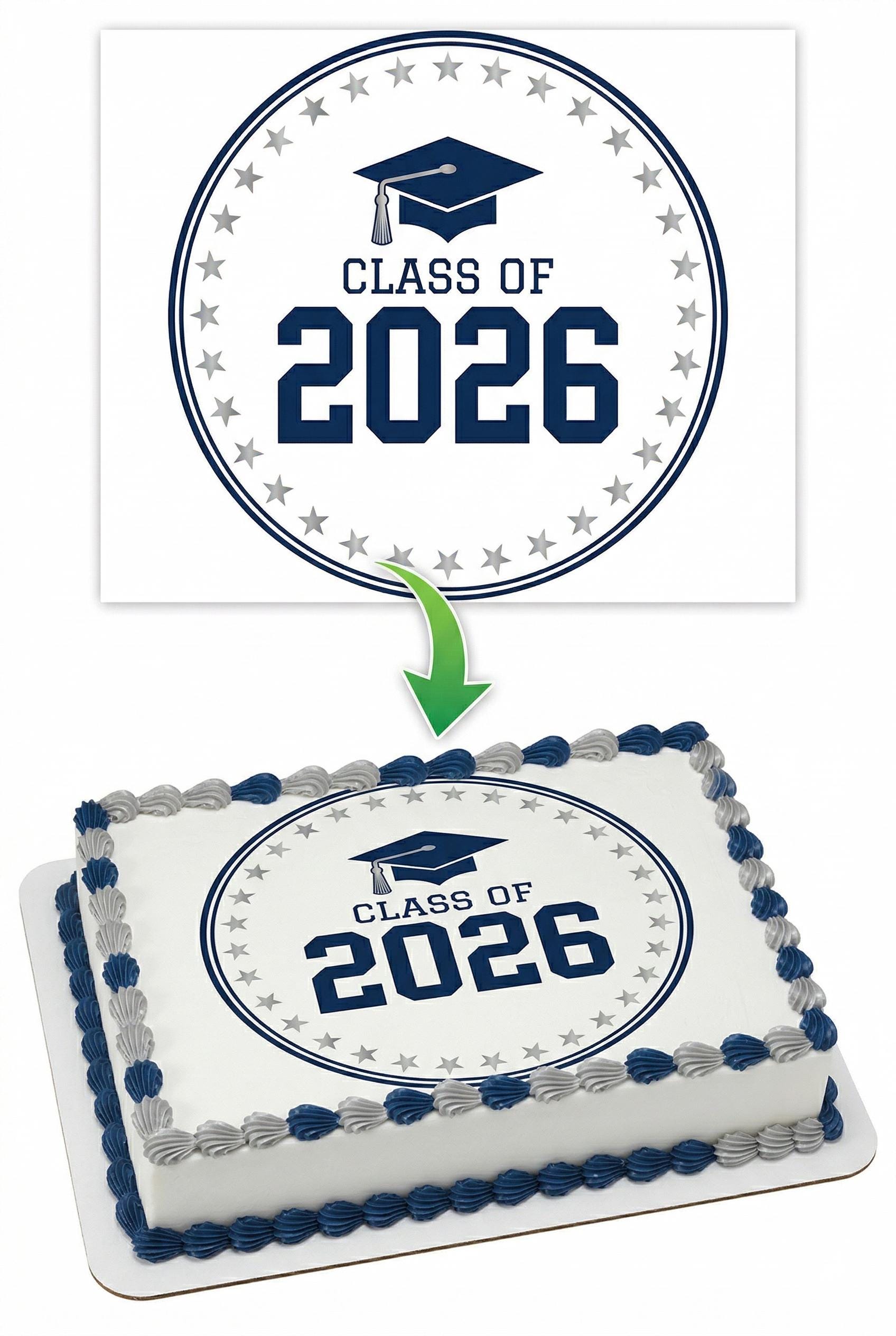 Class Of 2026 Navy Blue Stars Graduation Edible Cake Topper — a clean and classic commencement seal design perfect for graduation parties, open houses, and celebration desserts! Features a navy blue graduation cap with "Class of 2026" text surrounded by silver stars in an oval badge design, printed in crisp detail on a premium frosting sheet. A sharp, timeless look for any grad celebration. Available in 9 size options to fit any cake, cupcake, or dessert.
