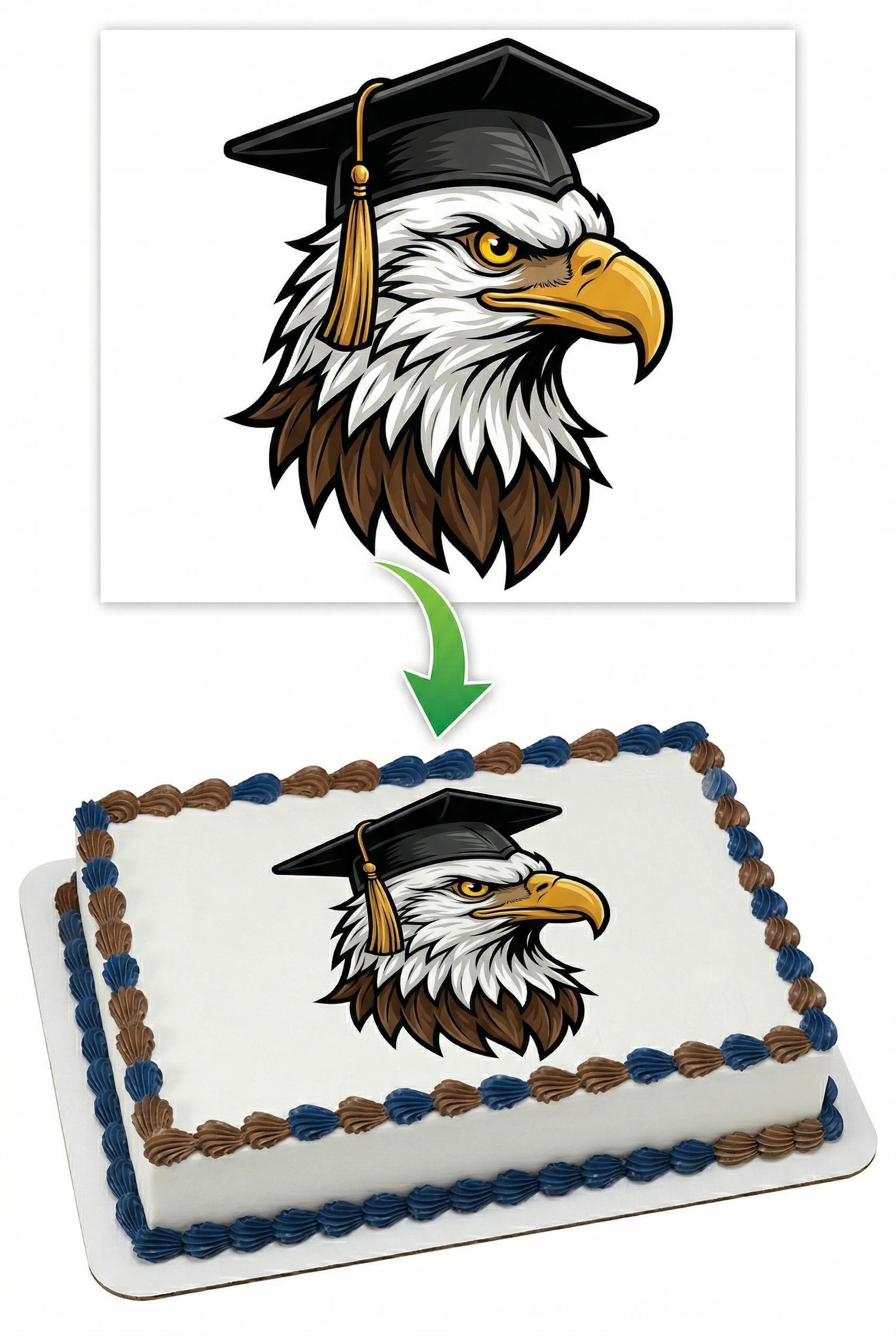 Bald Eagle Graduation Cap Mascot Edible Cake Topper — a proud and powerful school spirit graduation design perfect for commencement parties, open houses, and celebration desserts! Features a majestic bald eagle with brown and white plumage wearing a black graduation cap with gold tassel, printed in stunning detail on a premium frosting sheet. Perfect for any school with an eagle mascot or patriotic-themed grad celebrations. Available in 9 size options to fit any cake, cupcake, or dessert.