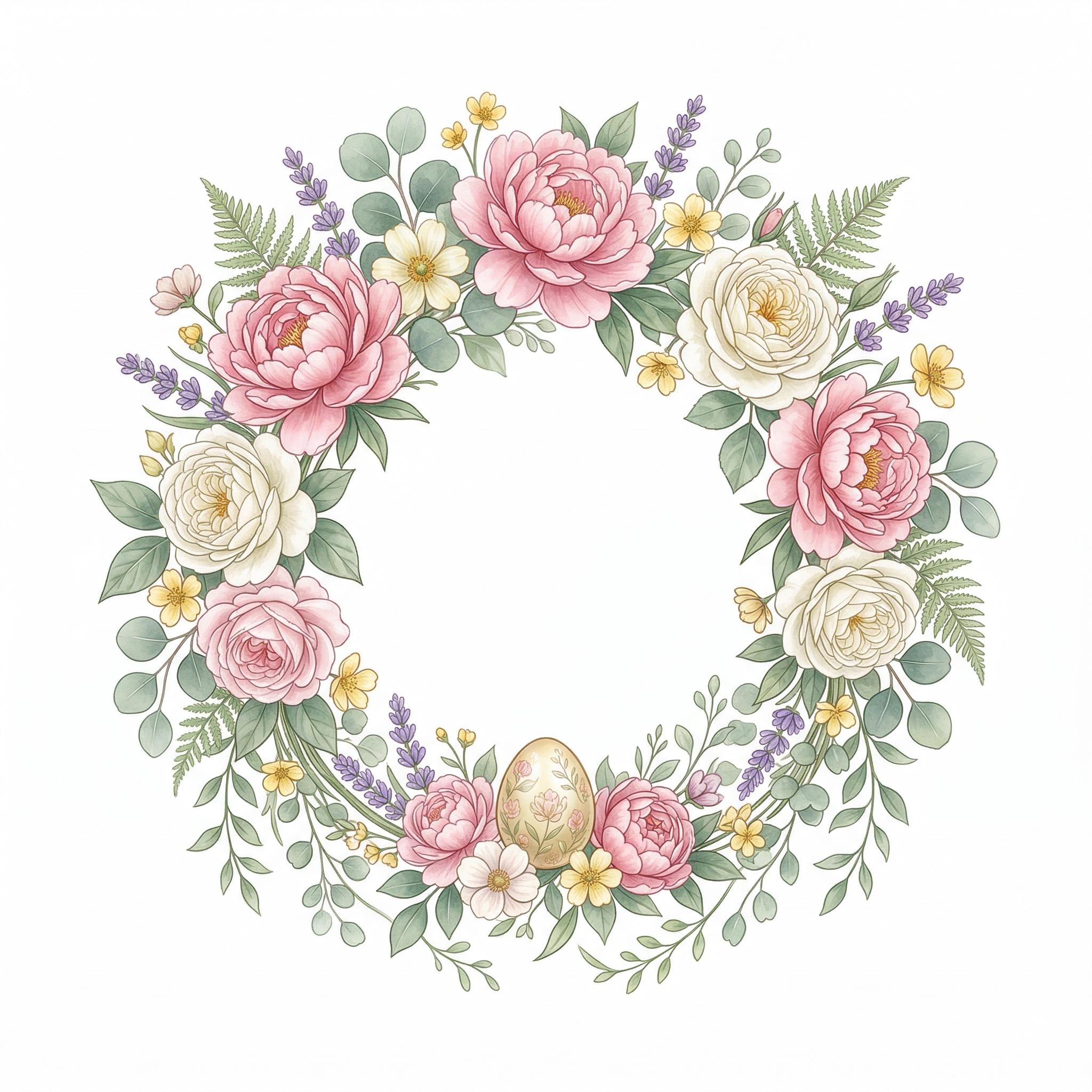 An elegant spring floral wreath with peonies, roses, eucalyptus, and a golden Easter egg — the most sophisticated Easter edible cake topper in our collection. This watercolor-inspired circular wreath features lush pink peonies, cream garden roses, lavender sprigs, yellow wildflowers, and sage green eucalyptus leaves forming a complete ring with a clear open center.