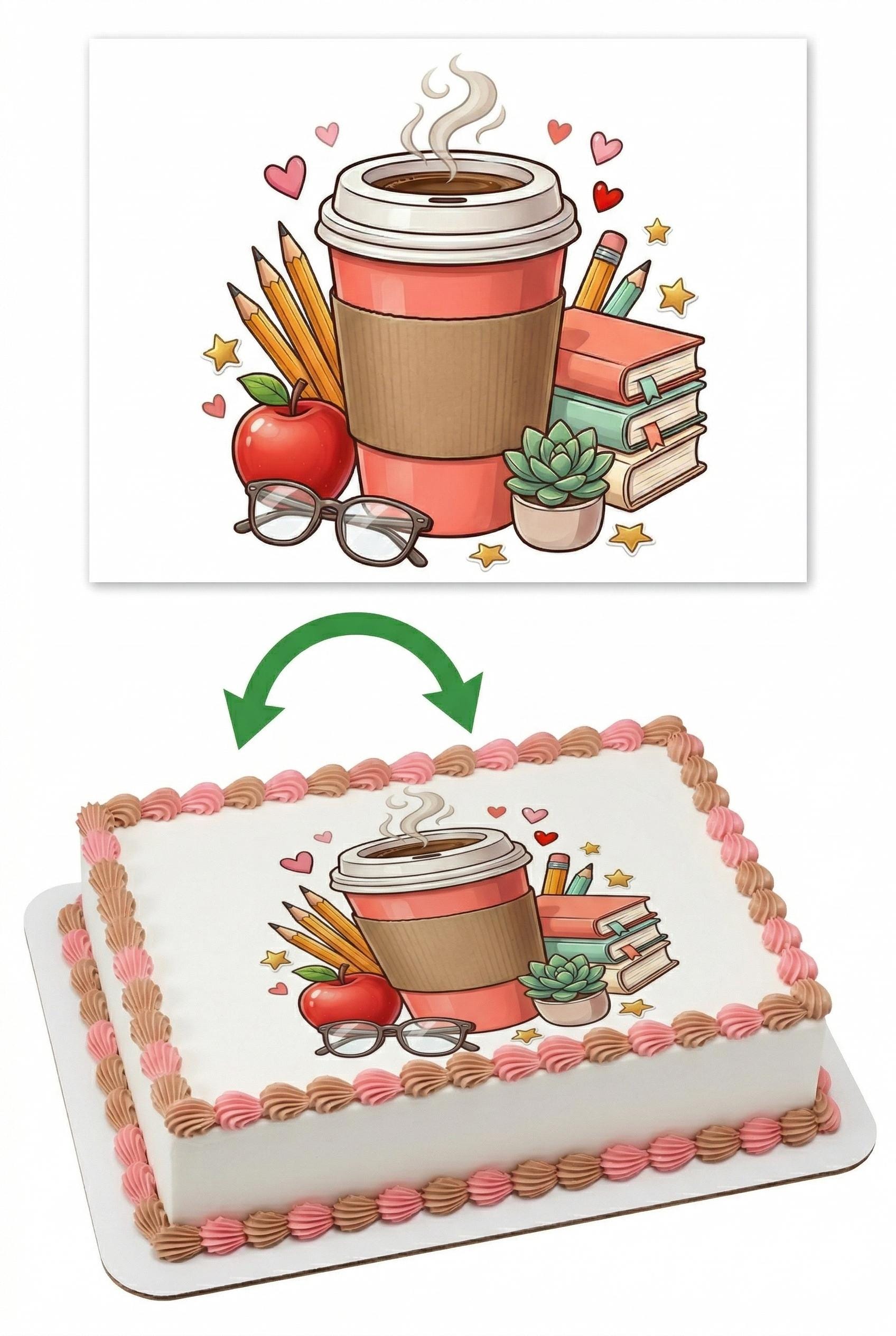 Teacher Coffee Books Edible Cake Topper, School Appreciation Frosting Sheet D30042
