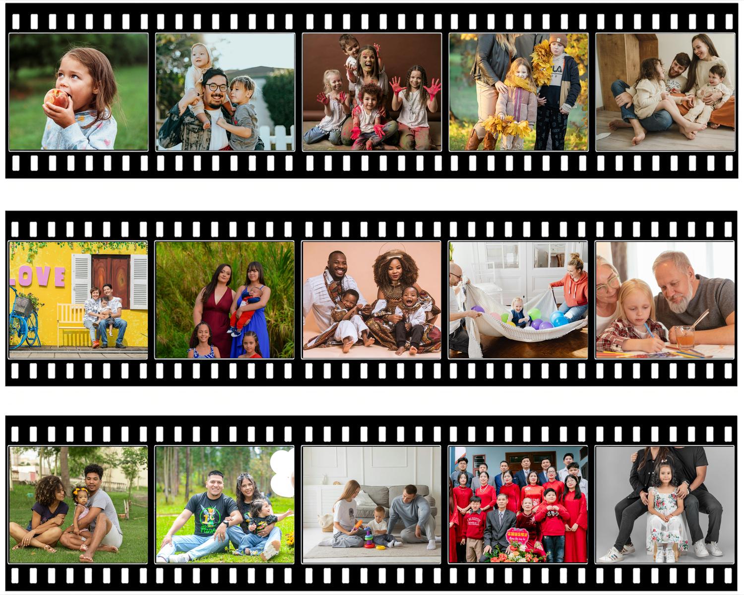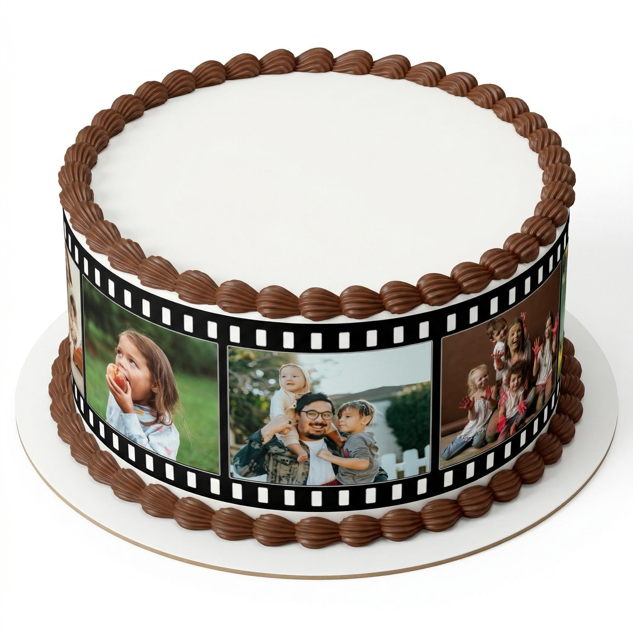 Film Strip Photo Collage Edible Cake Side Strip — a fun and creative way to display your favorite photos around any cake! Features a classic black and white movie film strip design where we add your personal photos into each frame. Simply send us your photos and we'll create a custom film reel wrap for your cake. Perfect for birthdays, anniversaries, retirements, graduations, memorials, and any celebration of memories. Available in 9 size options to fit any cake.