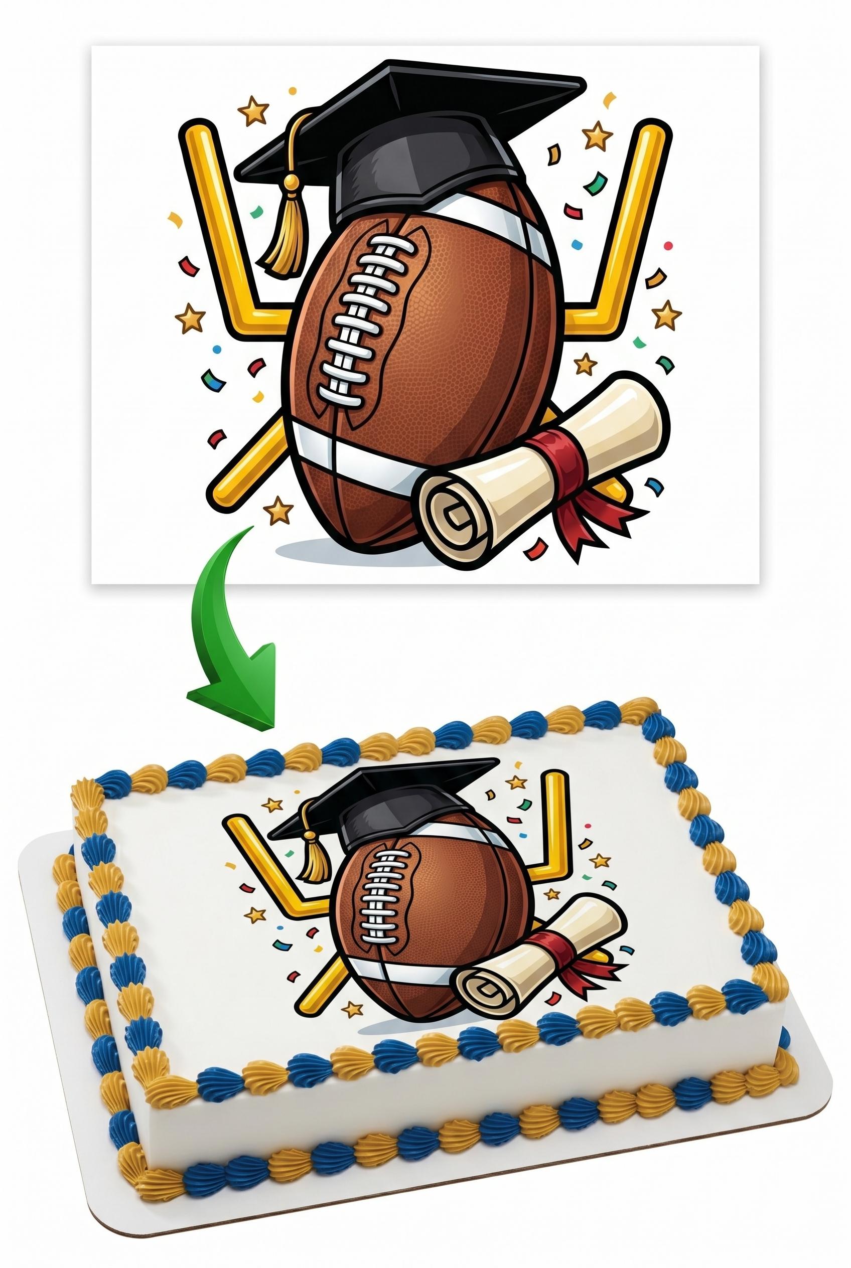 Football Graduation Cap Diploma Edible Cake Topper — Scholar Athlete Football with Grad Cap and Goal Posts Printed on Premium Frosting Sheet for Cakes, Cupcakes & Cookies. Celebrate the MVP Graduate. Free Custom Text!