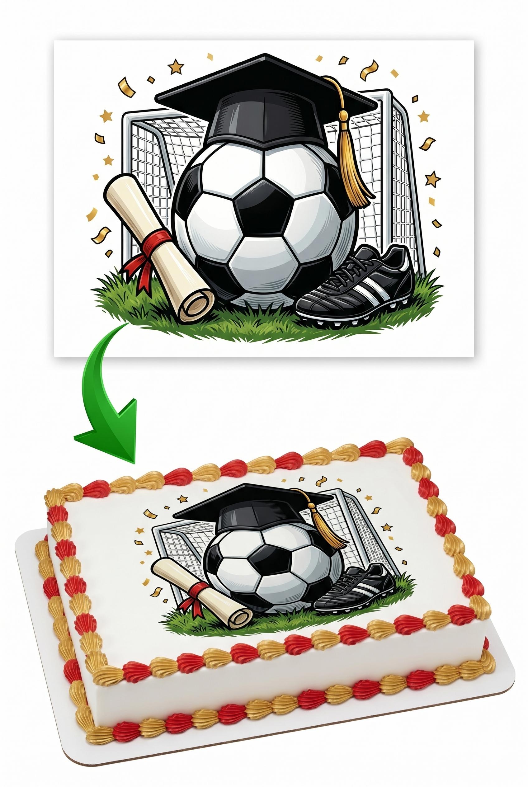 Your edible soccer graduation cake topper arrives printed exactly as pictured on a premium fondant frosting sheet (cake not included). Featuring a soccer ball in front of a goal wearing a black mortarboard cap with gold tassel, plus a rolled diploma with red ribbon, soccer cleats, grass details, and celebratory confetti — the perfect centerpiece for any graduate who dominated both on the field and in the classroom. Simply peel, trim, and place on any frosted dessert — it's that easy. Each edible image is made to order and printed with vibrant, food-safe edible ink on a high-quality icing sheet that blends seamlessly into buttercream, fondant, royal icing, or whipped frosting.
