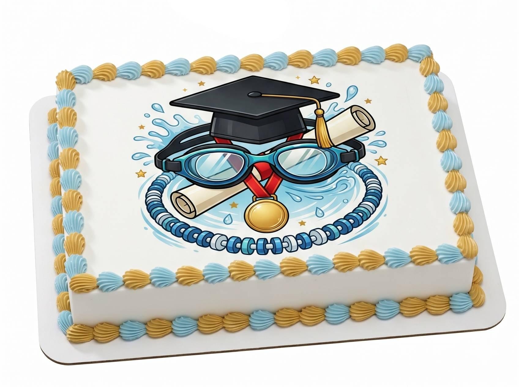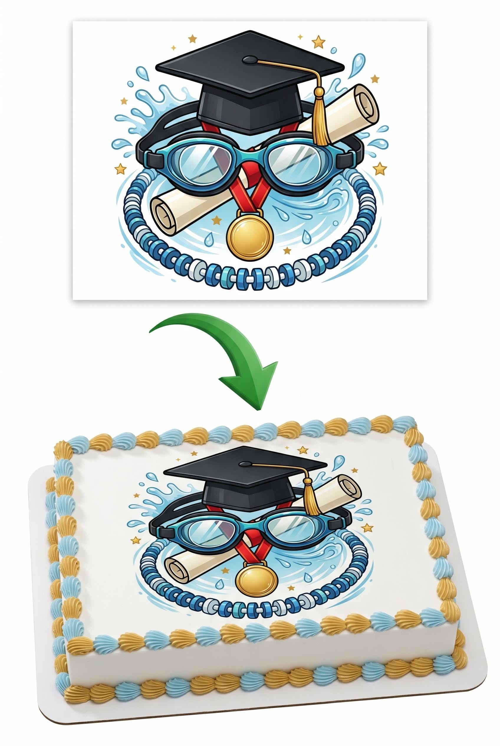 Your edible swimming graduation cake topper arrives printed exactly as pictured on a premium fondant frosting sheet (cake not included). Featuring swim goggles, a black mortarboard cap with gold tassel, a gold medal, lane rope, rolled diplomas, and water splash details — the perfect centerpiece for any graduate who made waves in the pool and in the classroom. Simply peel, trim, and place on any frosted dessert — it's that easy. Each edible image is made to order and printed with vibrant, food-safe edible ink on a high-quality icing sheet that blends seamlessly into buttercream, fondant, royal icing, or whipped frosting.