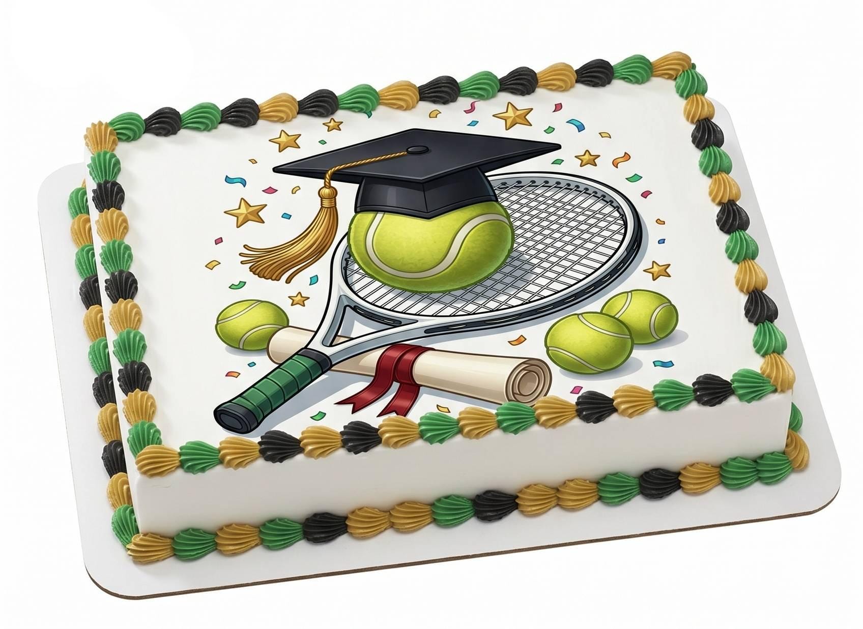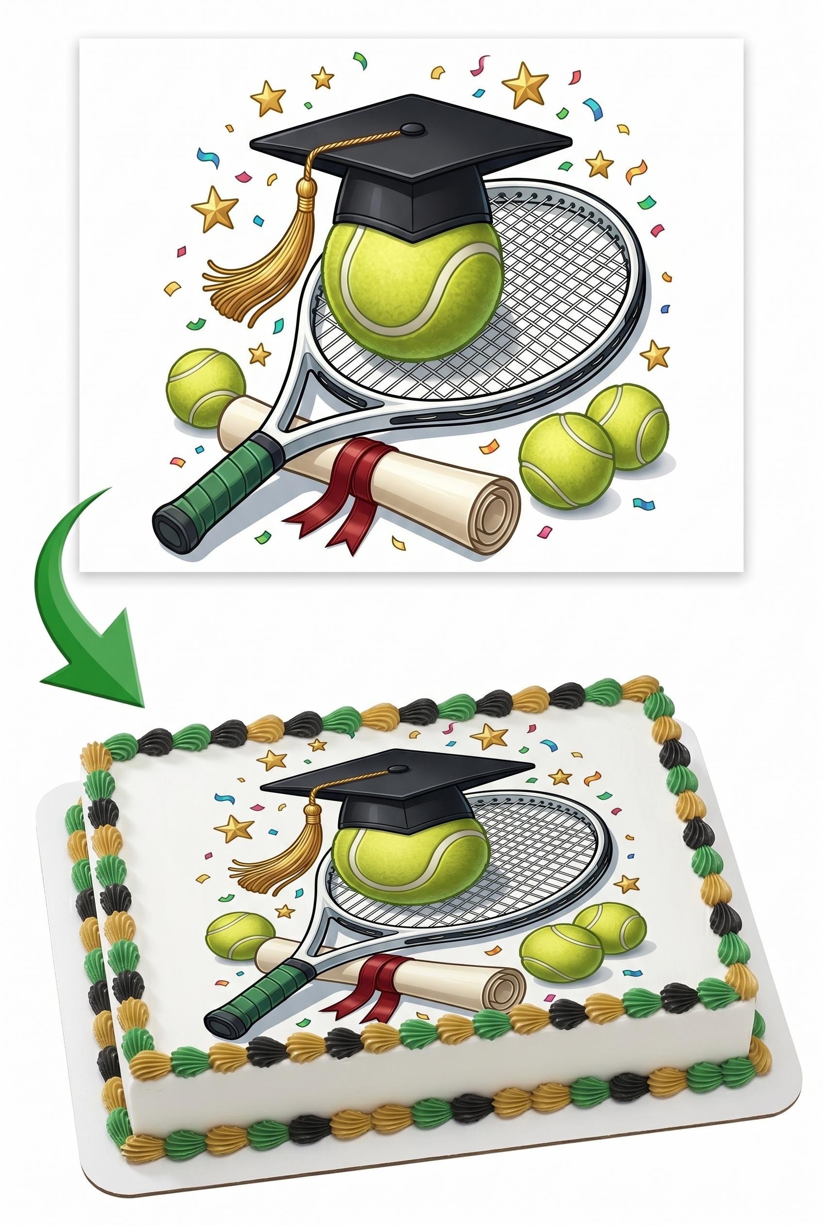 Tennis Graduation Cap Diploma Edible Cake Topper — Scholar Athlete Tennis Racket and Ball Design Printed on Premium Frosting Sheet for Cakes, Cupcakes & Cookies. Celebrate the Champion Graduate. Free Custom Text!