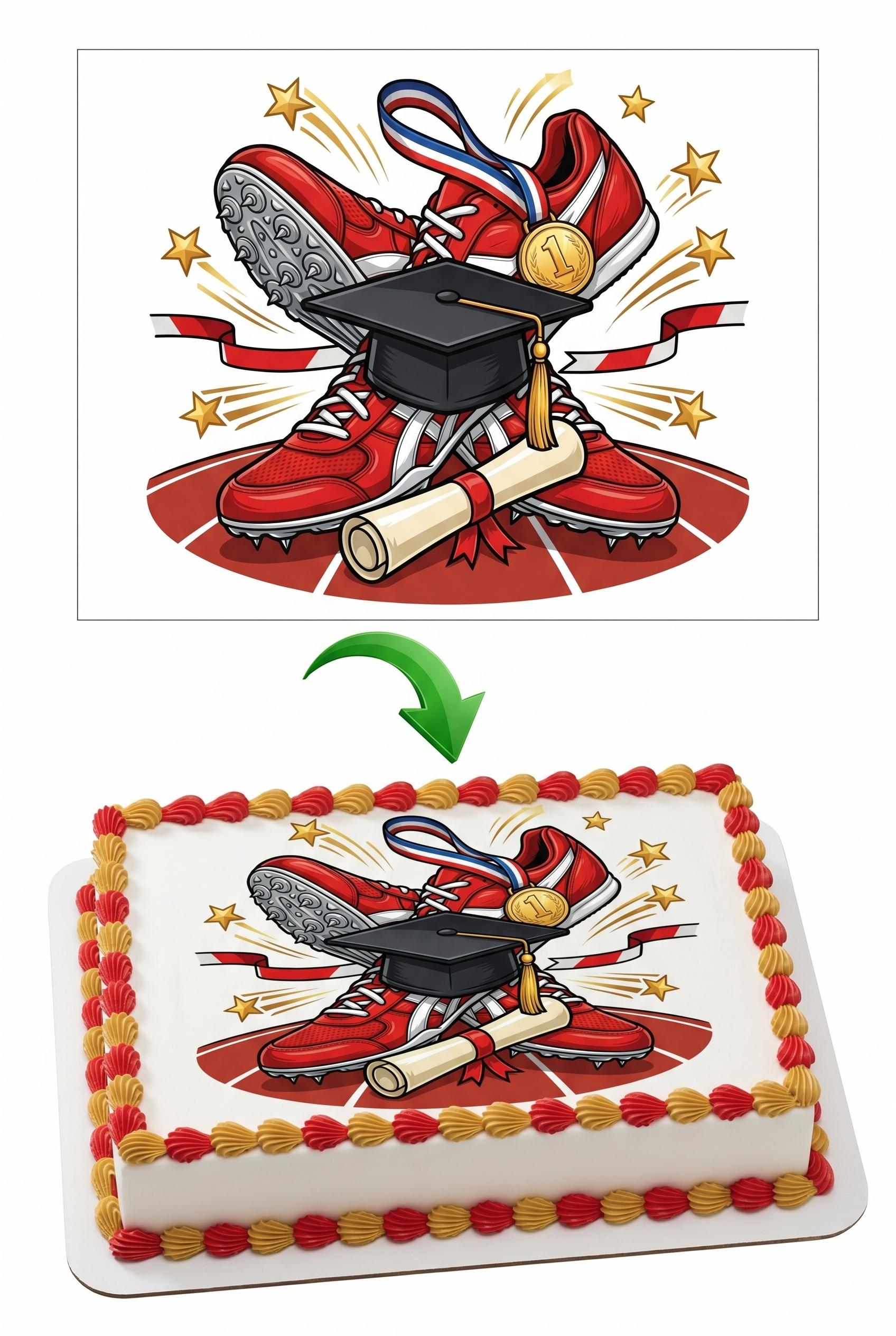 Your edible track graduation cake topper arrives printed exactly as pictured on a premium fondant frosting sheet (cake not included). Featuring red track spikes, a black mortarboard cap with gold tassel, a gold medal, rolled diploma, ribbon accents, and starburst details — the perfect centerpiece for any graduate who gave their all on the track and in the classroom. Simply peel, trim, and place on any frosted dessert — it's that easy. Each edible image is made to order and printed with vibrant, food-safe edible ink on a high-quality icing sheet that blends seamlessly into buttercream, fondant, royal icing, or whipped frosting.