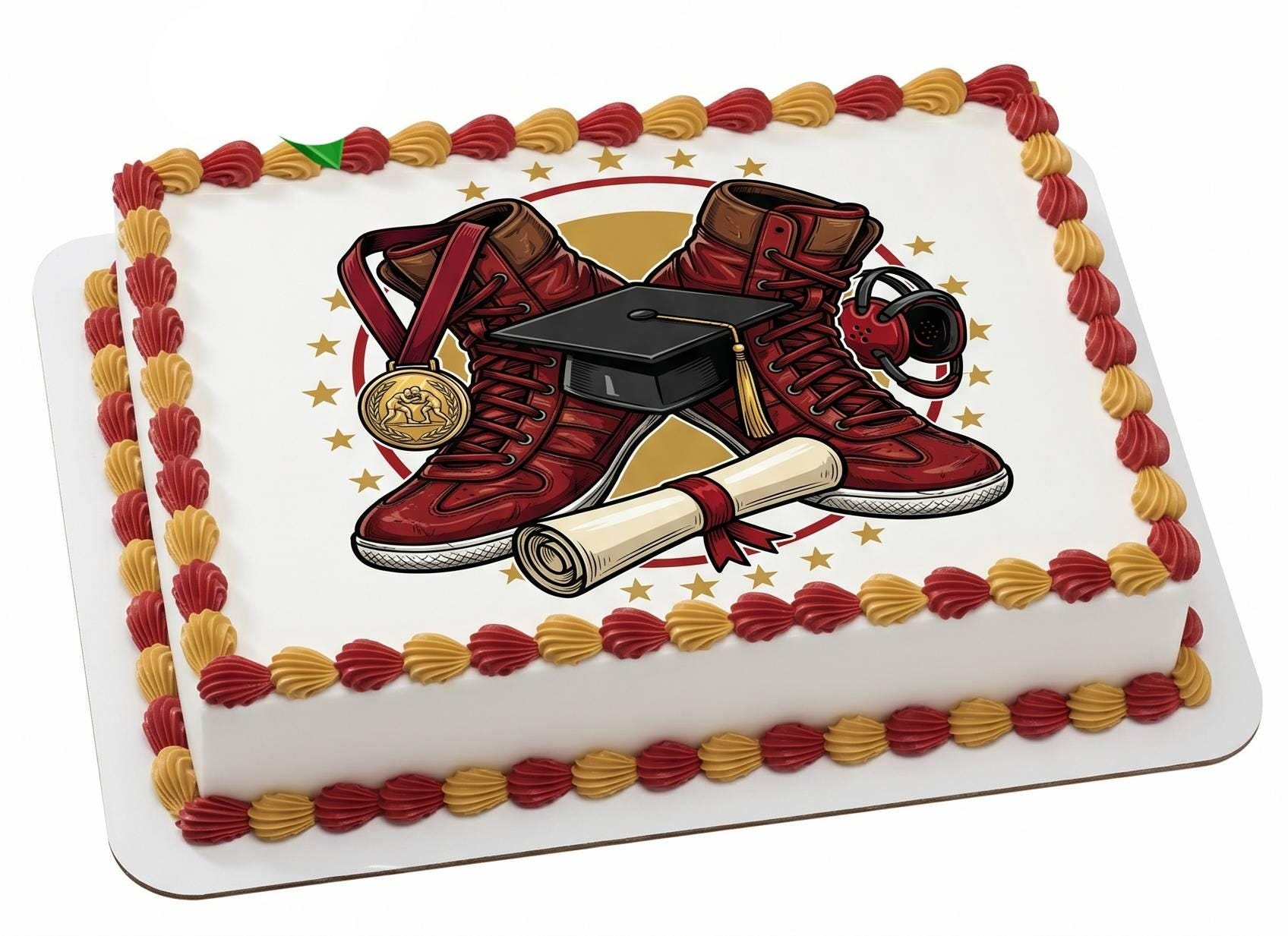 Your edible wrestling graduation cake topper arrives printed exactly as pictured on a premium fondant frosting sheet (cake not included). Featuring red wrestling shoes, a black mortarboard cap with gold tassel, a championship medal, rolled diploma with red ribbon, and headgear accents — the perfect centerpiece for any graduate who trained hard on the mat and in the classroom. Simply peel, trim, and place on any frosted dessert — it's that easy. Each edible image is made to order and printed with vibrant, food-safe edible ink on a high-quality icing sheet that blends seamlessly into buttercream, fondant, royal icing, or whipped frosting.