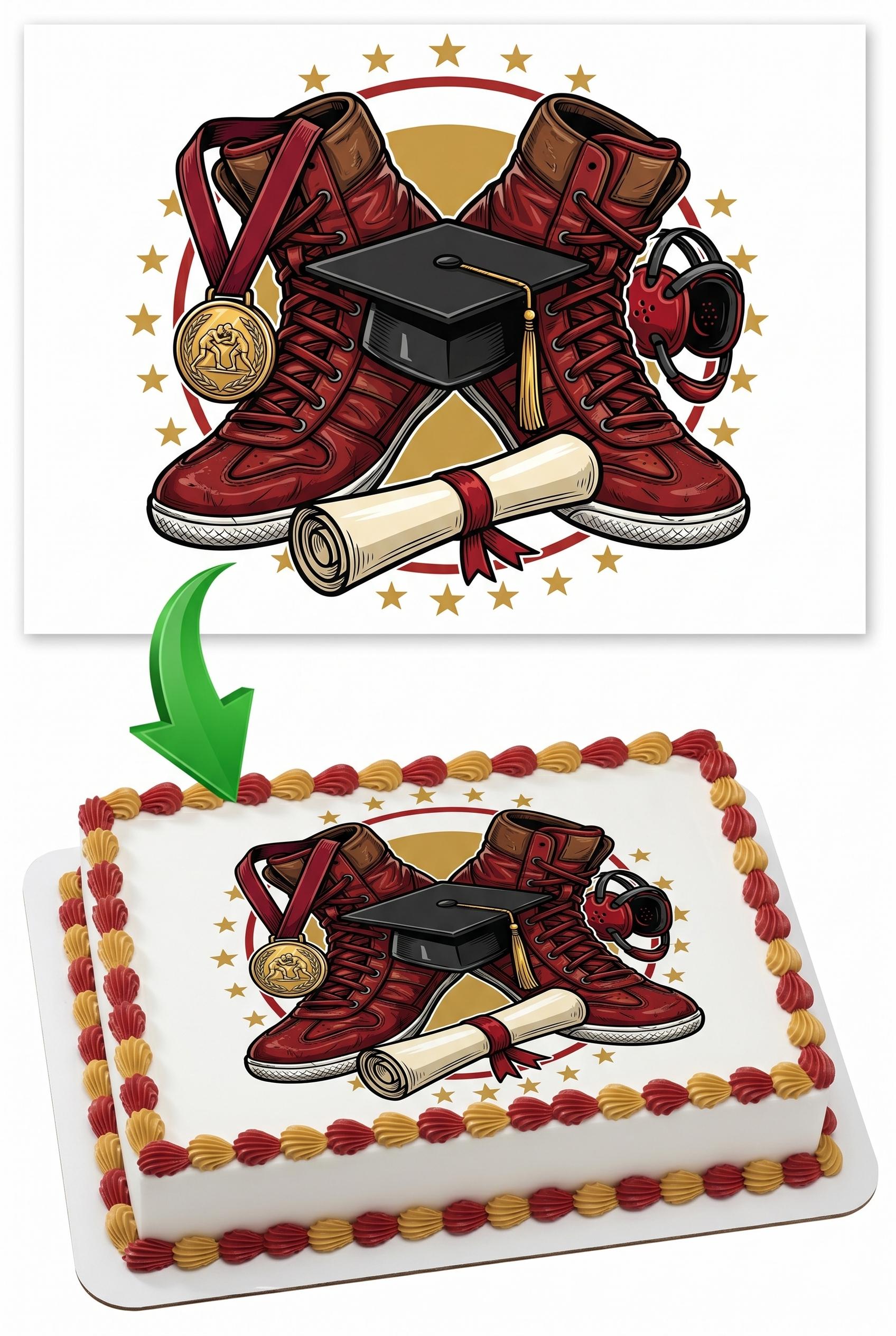 Wrestling Graduation Cap Diploma Edible Cake Topper — Scholar Athlete Wrestling Shoes and Medal Design Printed on Premium Frosting Sheet for Cakes, Cupcakes & Cookies. Celebrate the Champion Graduate. Free Custom Text!