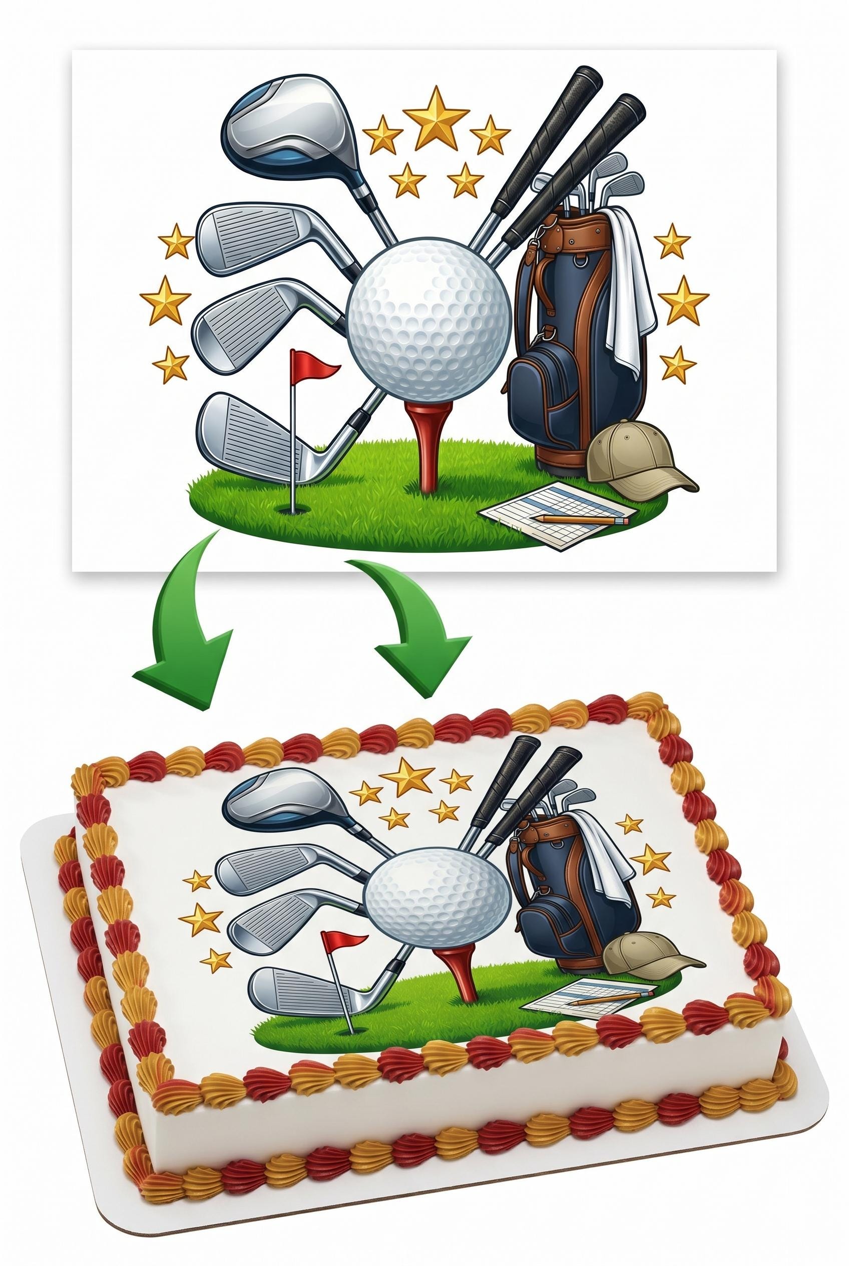 Your edible Father’s Day golf cake topper arrives printed exactly as pictured on a premium fondant frosting sheet (cake not included). Featuring a large golf ball on a tee surrounded by golf clubs, a golf bag, scorecard, cap, flag, and stars — this sporty design is the perfect centerpiece for celebrating Dad, Grandpa, or any father figure who loves spending time on the course. Simply peel, trim, and place on any frosted dessert — it's that easy. Each edible image is made to order and printed with vibrant, food-safe edible ink on a high-quality icing sheet that blends seamlessly into buttercream, fondant, royal icing, or whipped frosting.