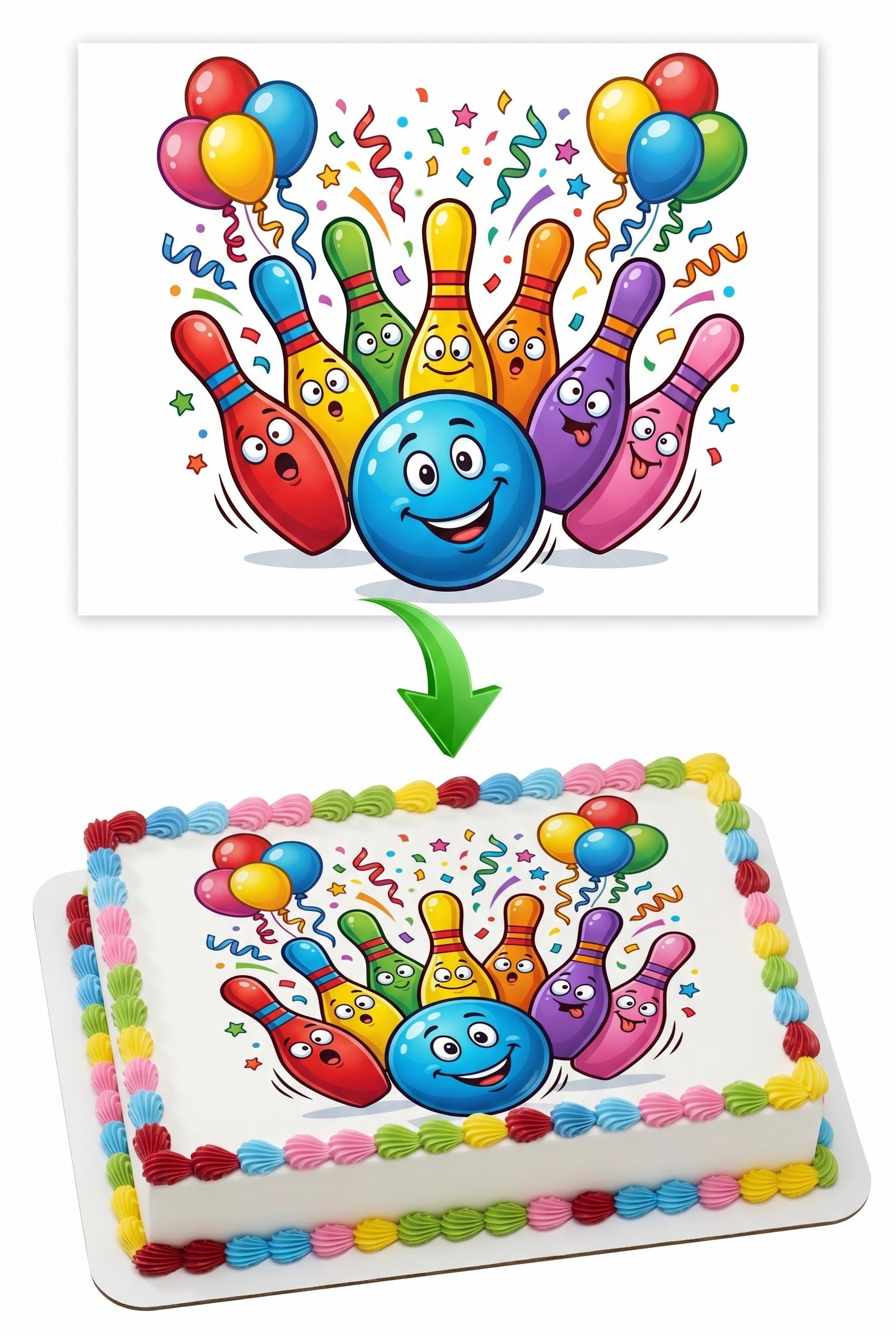Cute Bowling Party Edible Cake Topper — Cartoon Bowling Ball and Pins Design Printed on Premium Frosting Sheet for Cakes, Cupcakes & Cookies. Perfect for Kids Bowling Parties. Free Custom Text!