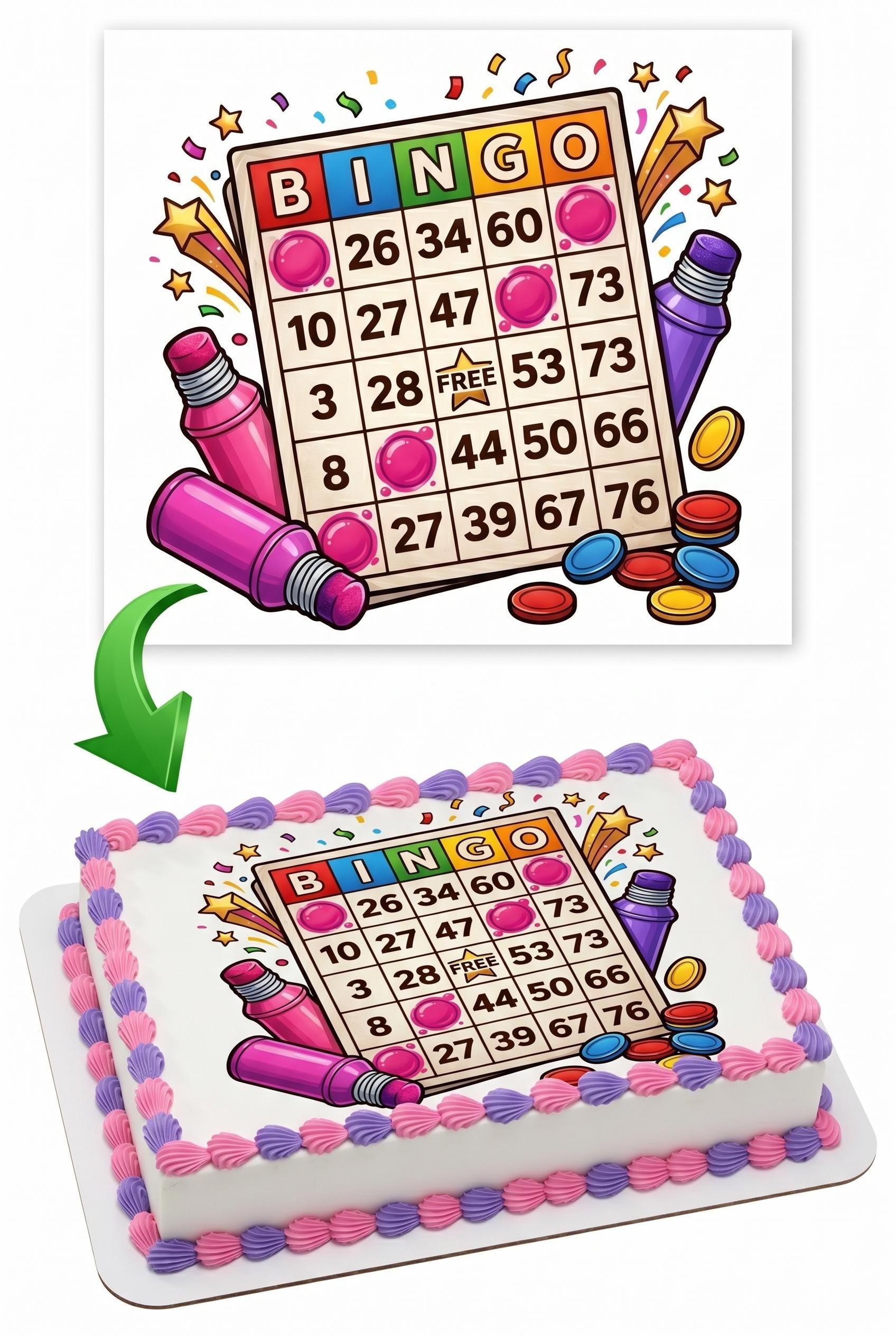 Cute Bingo Party Edible Cake Topper — Colorful Bingo Card and Dauber Design Printed on Premium Frosting Sheet for Cakes, Cupcakes & Cookies. Perfect for Bingo Fans. Free Custom Text!