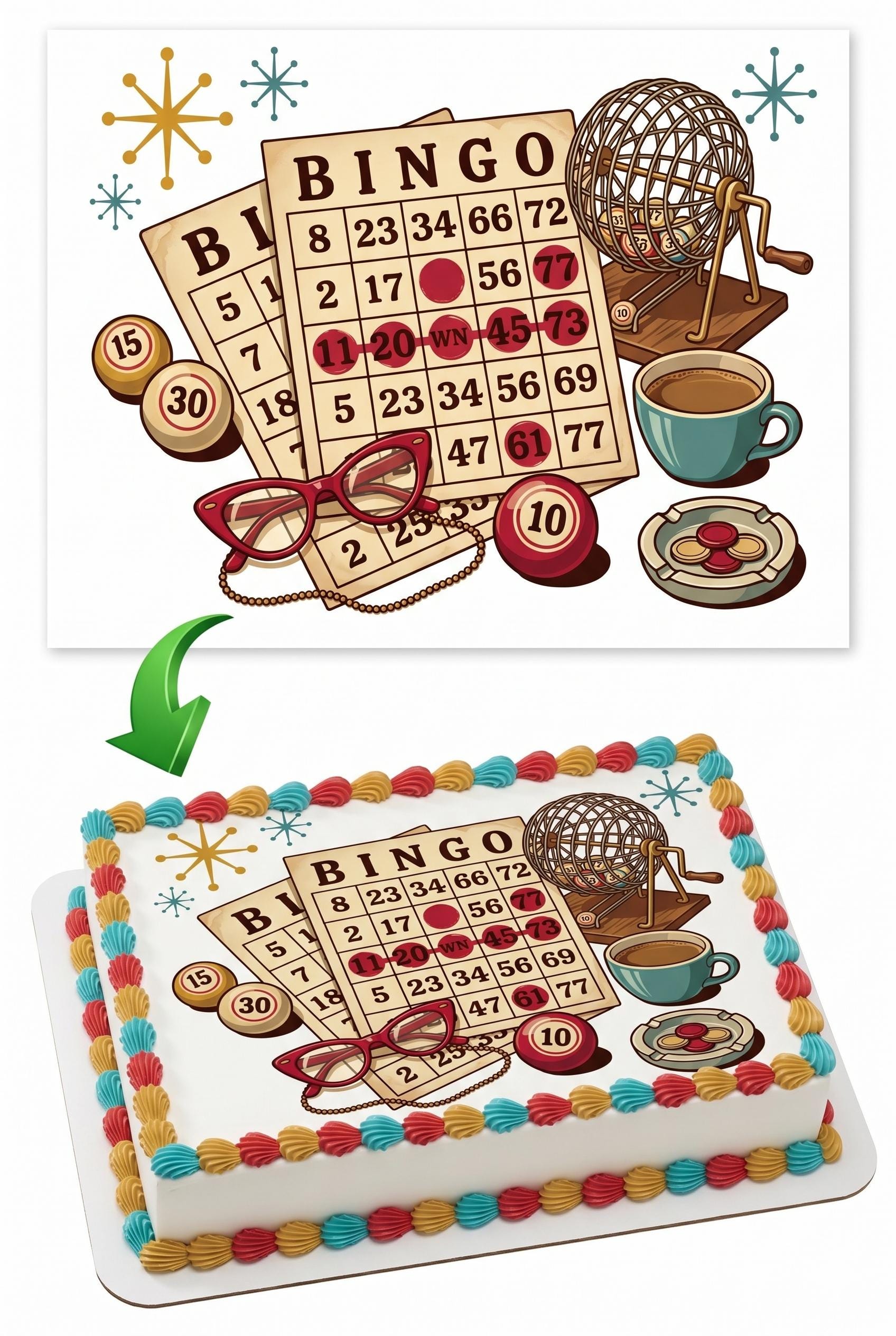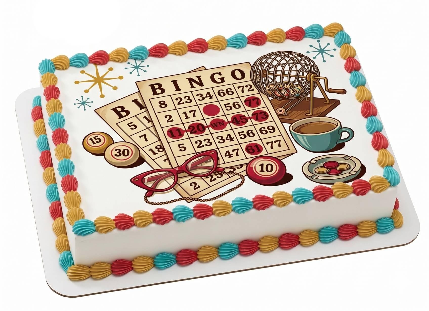 Your edible bingo cake topper arrives printed exactly as pictured on a premium fondant frosting sheet (cake not included). Featuring vintage style bingo cards, a classic bingo cage, numbered chips, retro glasses, coffee cup, and playful mid-century starburst accents — this nostalgic design makes the perfect centerpiece for bingo birthdays, retirement parties, ladies night gatherings, fundraiser events, and retro game night celebrations. Simply peel, trim, and place on any frosted dessert — it's that easy. Each edible image is made to order and printed with vibrant, food-safe edible ink on a high-quality icing sheet that blends seamlessly into buttercream, fondant, royal icing, or whipped frosting.