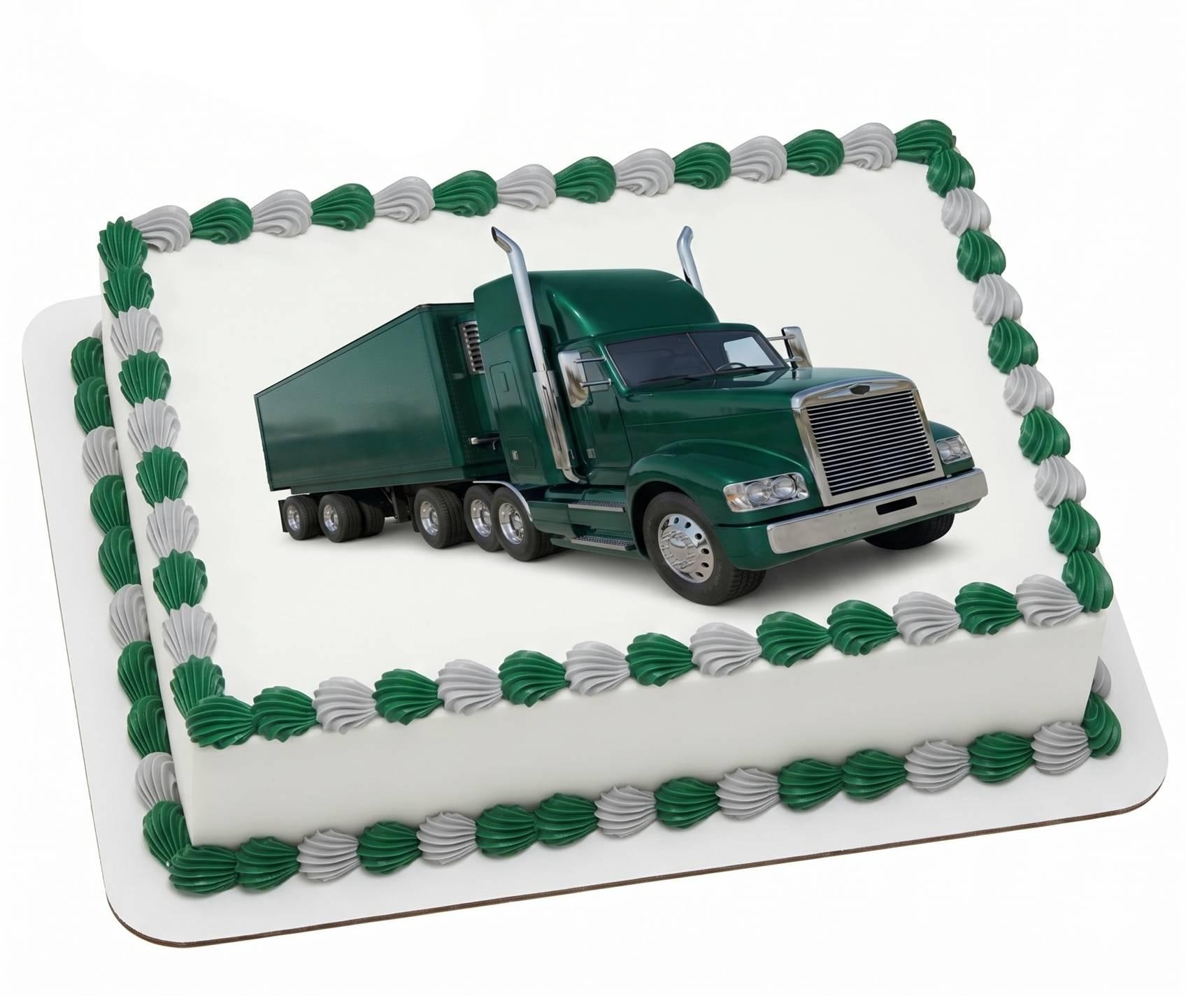 Green Semi Truck Edible Cake Topper — Realistic Big Rig Tractor Trailer Design Printed on Premium Frosting Sheet for Cakes, Cupcakes & Cookies. Perfect for Truck Lovers. Free Custom Text!