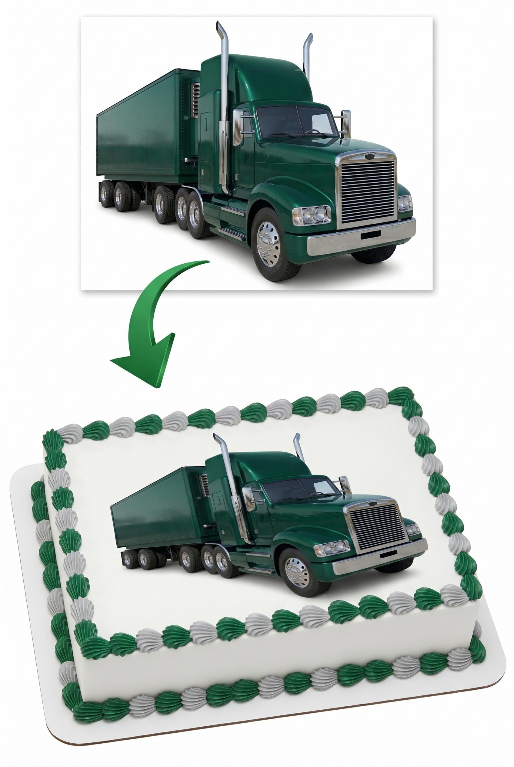 Your edible truck cake topper arrives printed exactly as pictured on a premium fondant frosting sheet (cake not included). Featuring a detailed green semi truck with matching trailer, chrome accents, and realistic big rig styling — this bold design makes the perfect centerpiece for trucking birthdays, retirement celebrations, CDL graduations, truck driver appreciation cakes, and transportation themed parties. Simply peel, trim, and place on any frosted dessert — it's that easy. Each edible image is made to order and printed with vibrant, food-safe edible ink on a high-quality icing sheet that blends seamlessly into buttercream, fondant, royal icing, or whipped frosting.