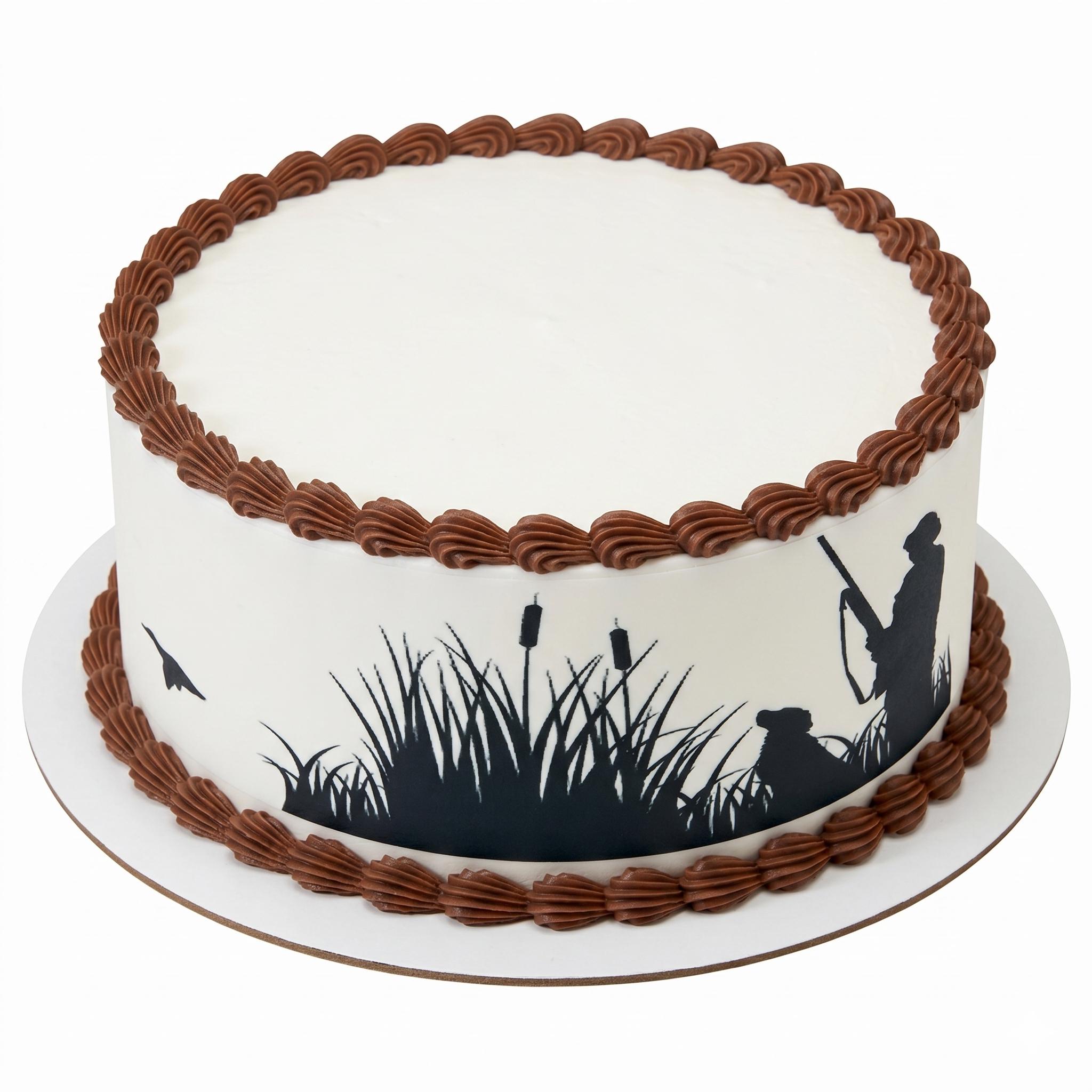 Our edible cake side strips arrive printed exactly as pictured on a premium fondant frosting sheet (cake not included). Each sheet includes 2 strips, approximately 9 x 3.5 inches each. A dramatic black silhouette of a duck hunter taking aim in a marsh, hunting dog by his side, cattails swaying, and a duck in flight — the perfect wrap for any waterfowl hunter's celebration. Simply trim to size with scissors or a pizza cutter, peel from the backing, and wrap around your frosted cake for a seamless, professional border. Made to order with vibrant, food-safe edible ink on a high-quality icing sheet that blends into buttercream, fondant, royal icing, or whipped frosting.