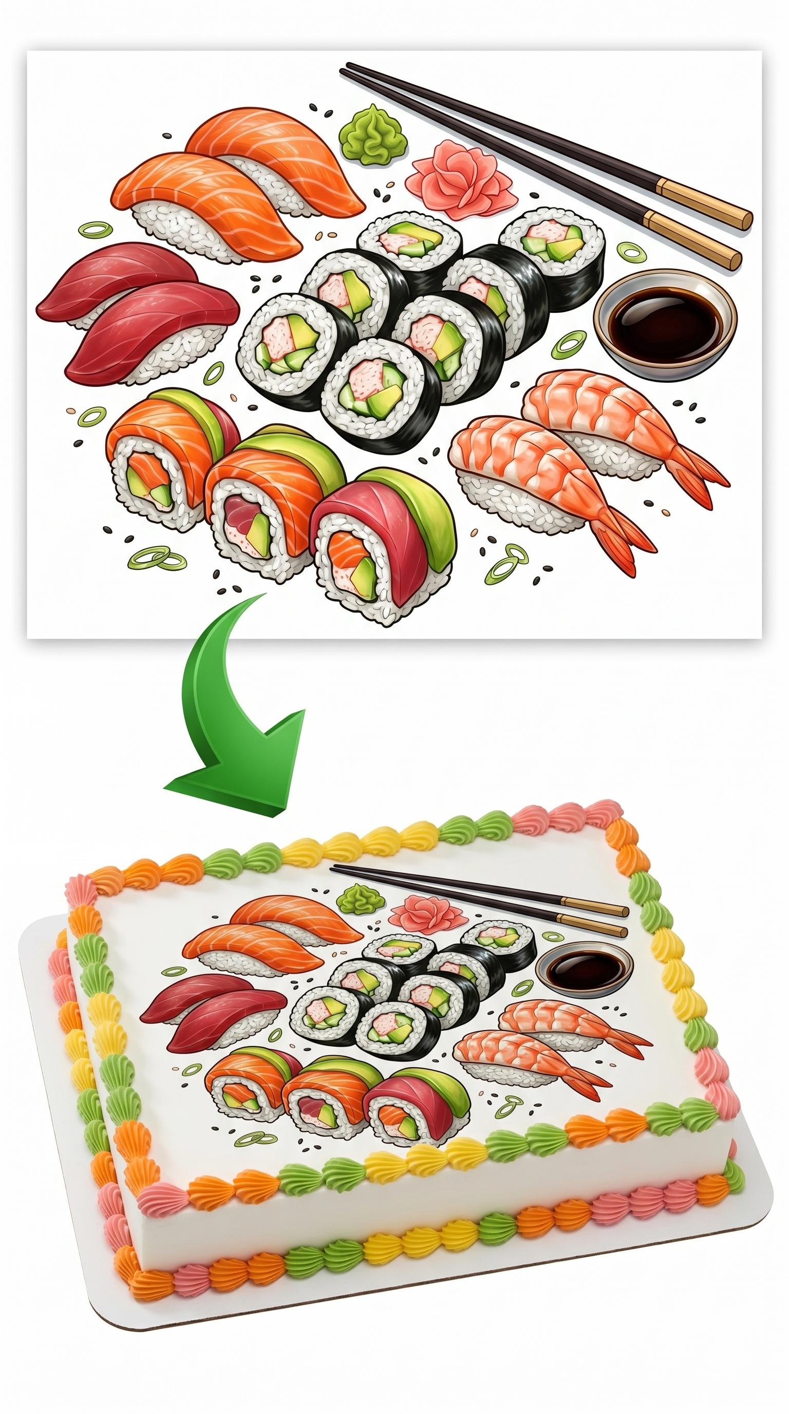 Our edible cake toppers arrive printed exactly as pictured on a premium fondant frosting sheet (cake not included). A vibrant, illustrated spread of sushi favorites — salmon nigiri, tuna nigiri, shrimp nigiri, maki rolls, rainbow rolls, chopsticks, wasabi, pickled ginger, and soy sauce — brings a fun, colorful Japanese food vibe to any cake. Perfect for sushi lovers of all ages, Japanese themed parties, and anyone whose love of sushi deserves a dedicated dessert. Simply trim to size, peel from the backing, and place on your frosted cake for a stunning, professional finish. Made to order with vibrant, food-safe edible ink on a high-quality icing sheet that blends seamlessly into buttercream, fondant, royal icing, or whipped frosting.