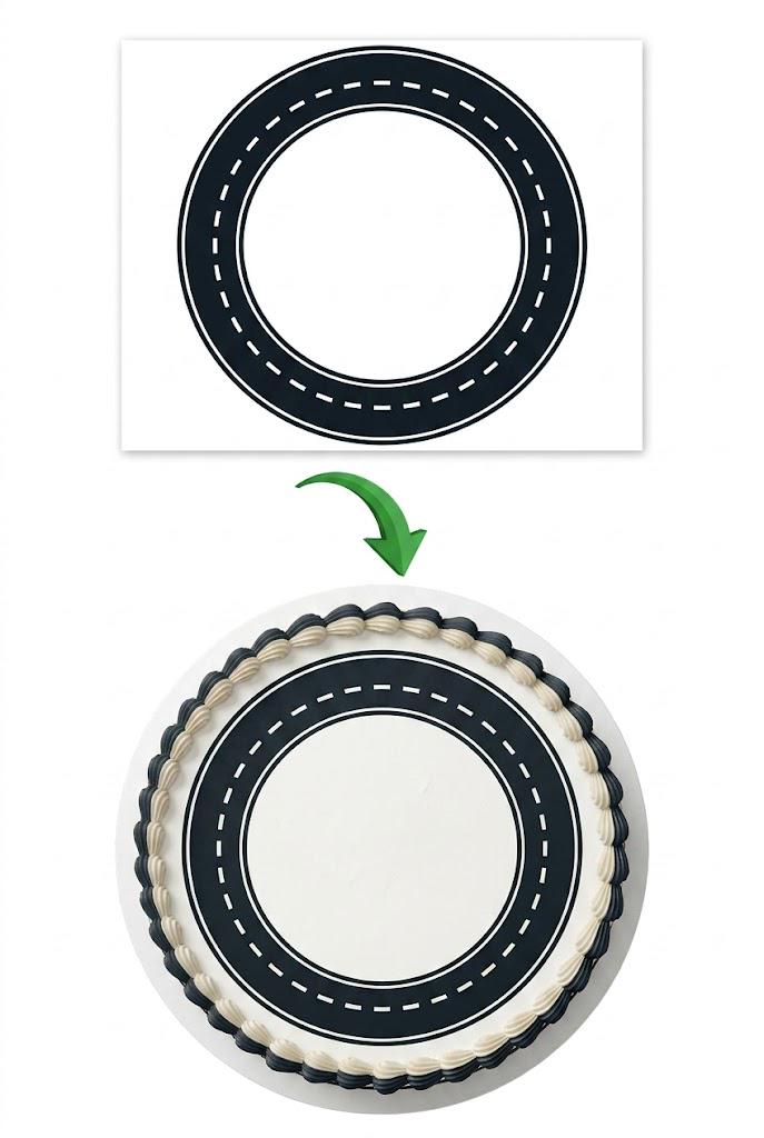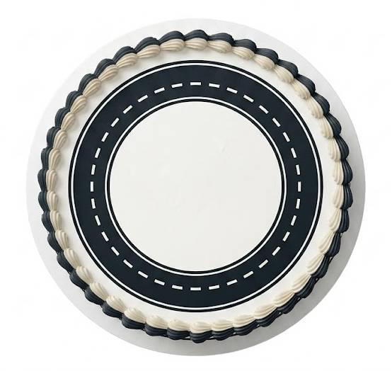 Rev up the fun with this circular race track edible cake topper featuring a black road with white dashed center lines — designed as a base for adding toy cars, figures, or custom text in the center. A versatile, clean design that's perfect for car-loving kids and racing fans of all ages.